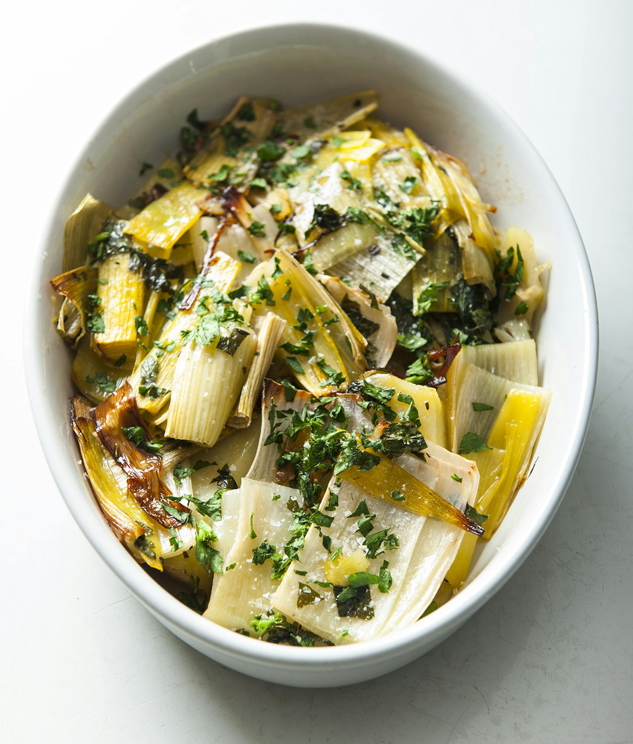 This simple dish of roasted leeks is deceptively simple. Most recipes call for blanching the leeks first to soften them before they roast. While that speeds the process, the same thing can be accomplished by baking them in a covered dish, then browning them uncovered. It takes a little longer, but saves some of the fuss.