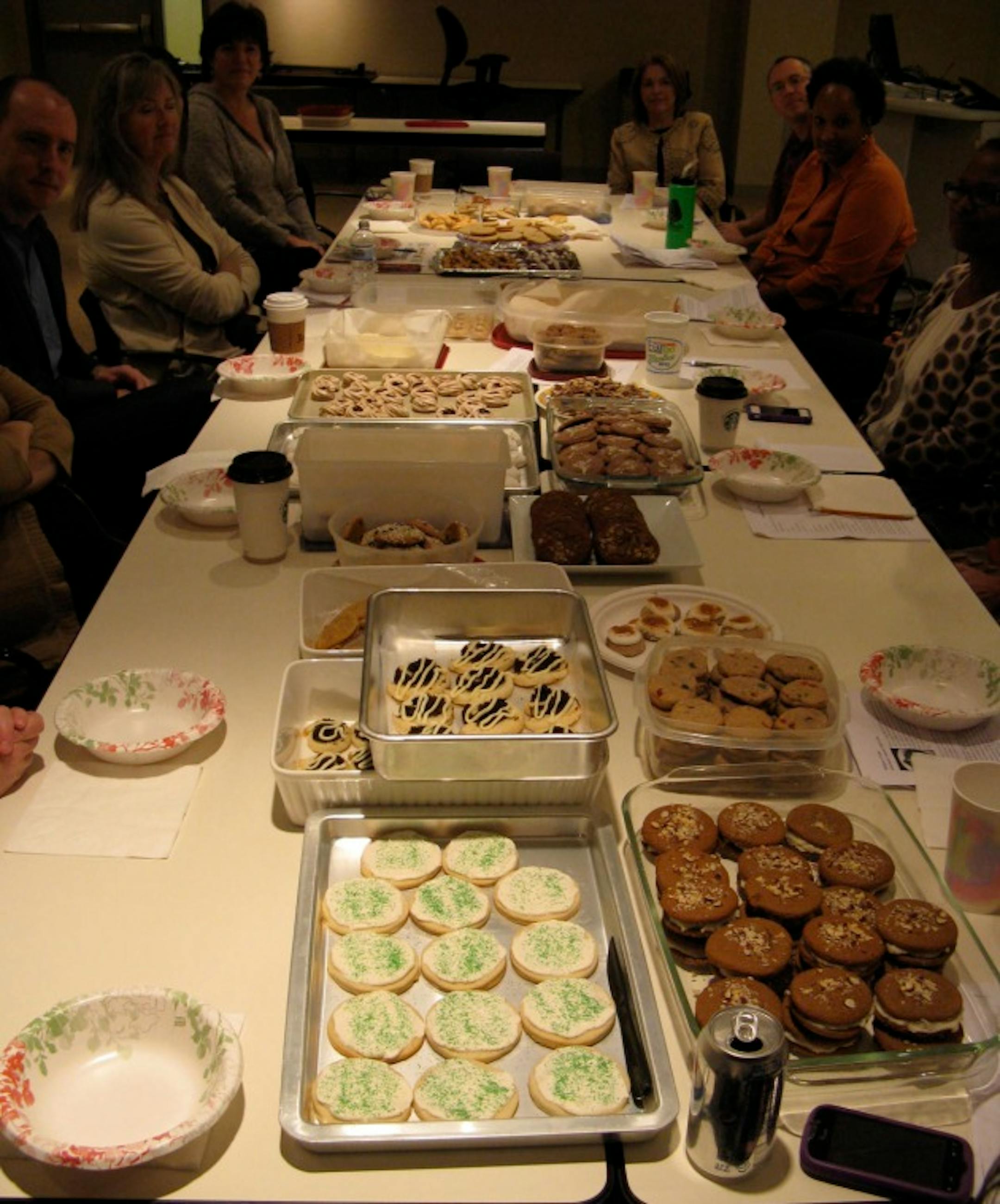 Then we gathered around a conference table, glasses of milk in hand, and passed around trays, plates, platters, Tupperware containers and baking sheets bearing all 28 cookies.