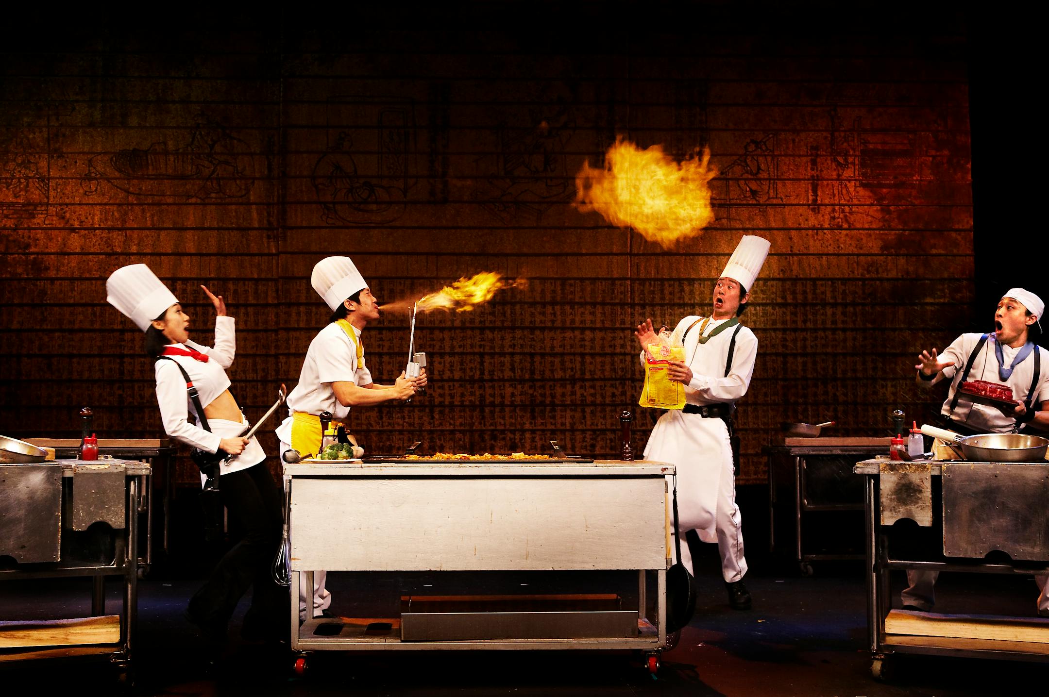 What is it about? Also known as "Nanta" in Korean for the way one strikes a drum, "Cookin'" is a splashy, wacky import from South Korea, where it has been playing since 1997. In the show, four frenzied chefs try to prepare a wedding feast in an hour. They blow fire and mix martial arts as they slice and dice veggies to a score of traditional Korean drumming.