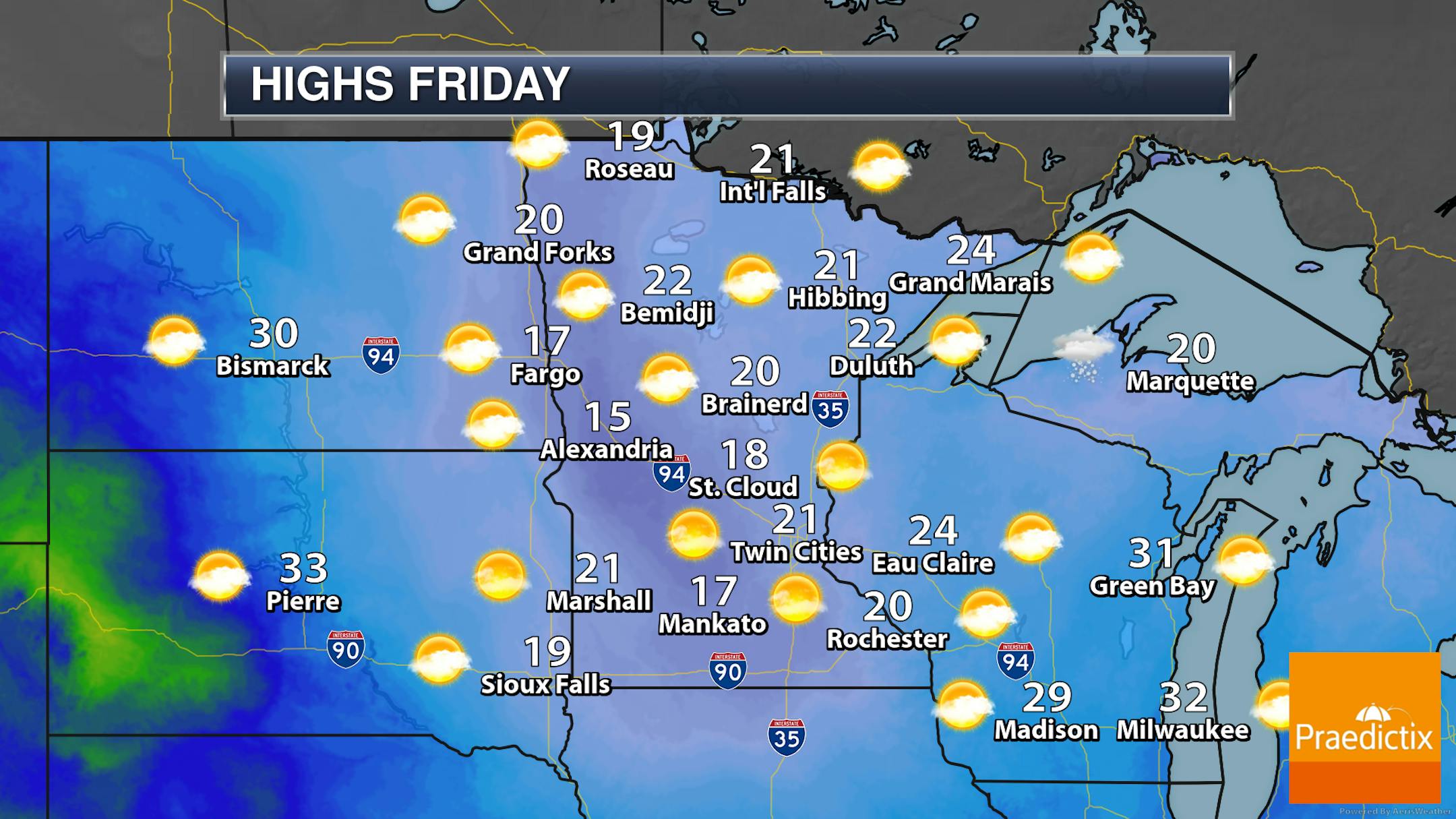 While sunnier skies are expected across much of the state, some thicker cloud cover could hang around in western and far southern Minnesota. Highs will be in the teens and 20s across the state.