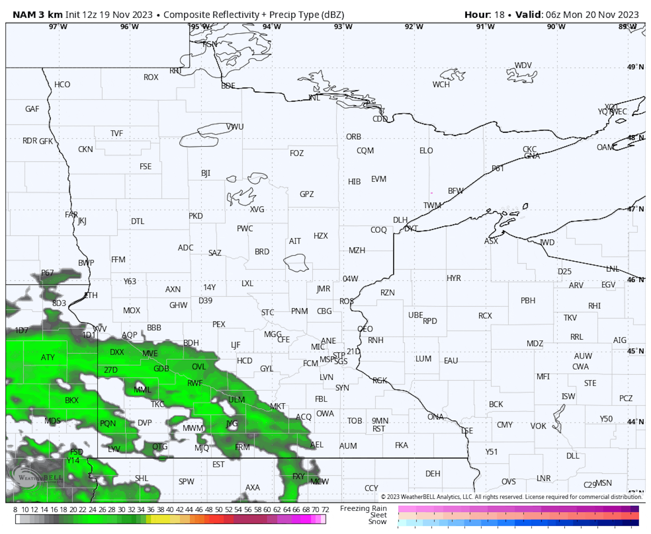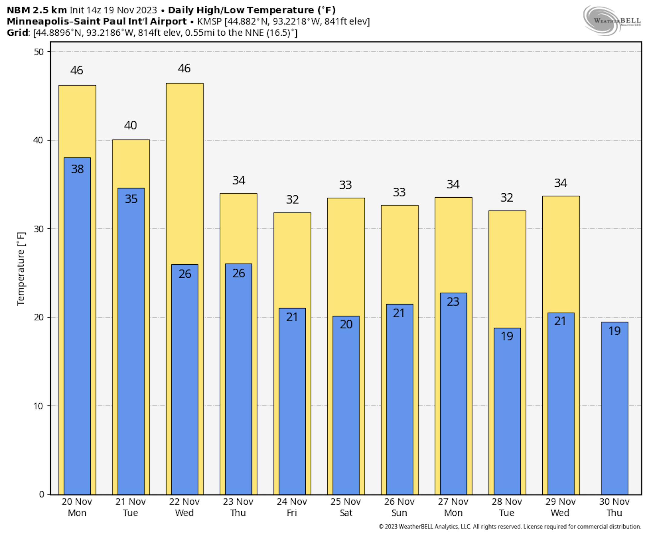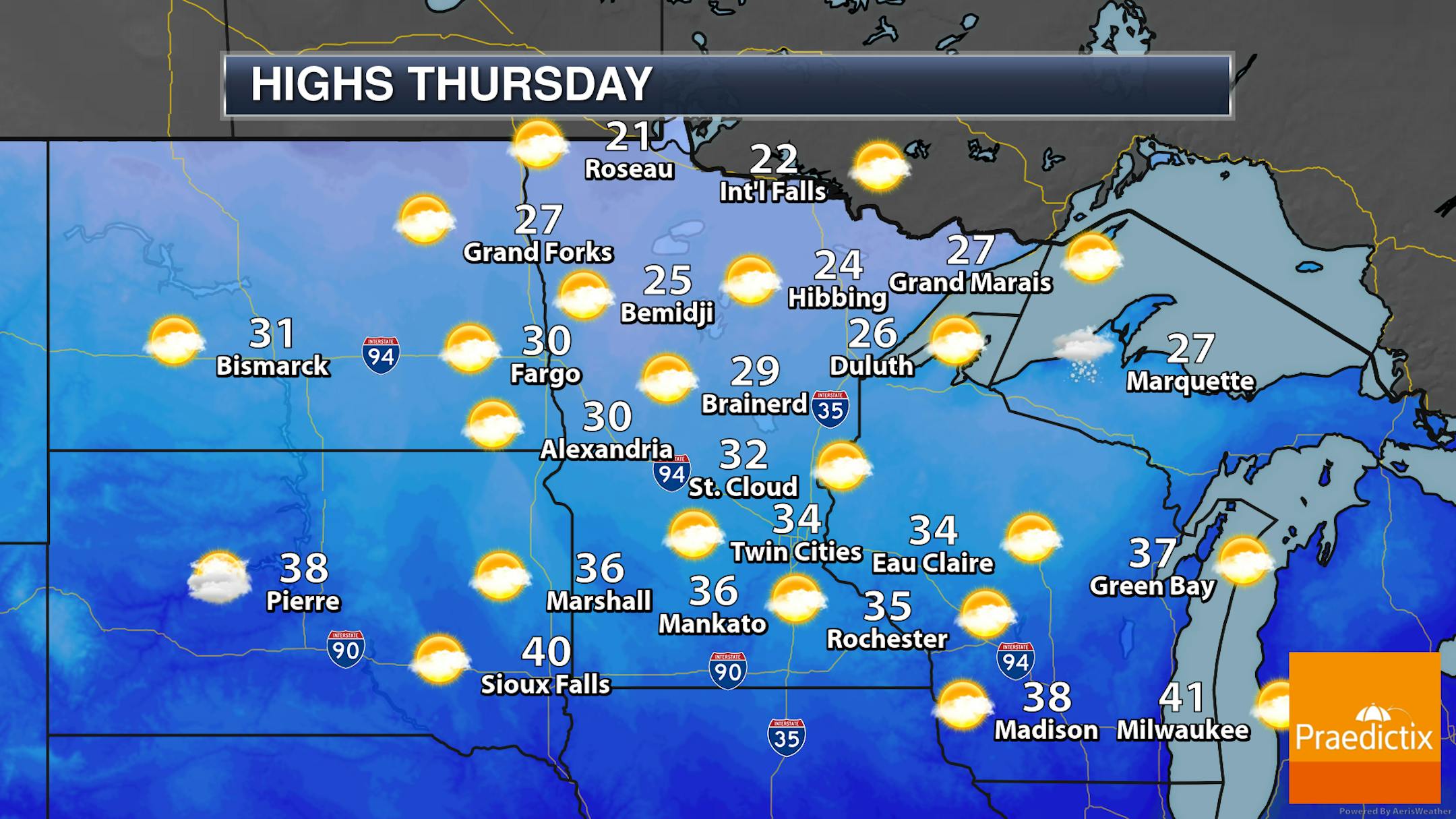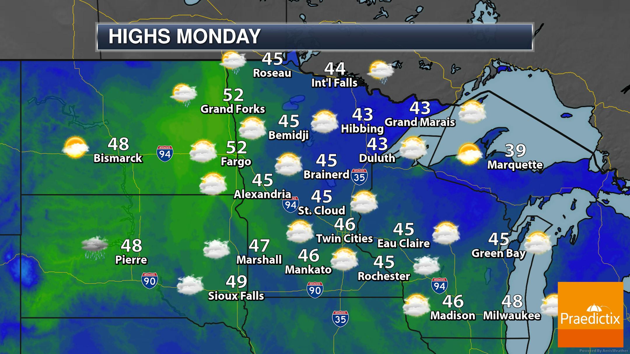 A warmer-than-average and mostly cloudy day is expected across the state, with some rain or drizzle in spots (as shown above in that forecast loop). Highs will mainly be in the 40s across the state but could touch 50F in the Red River Valley.