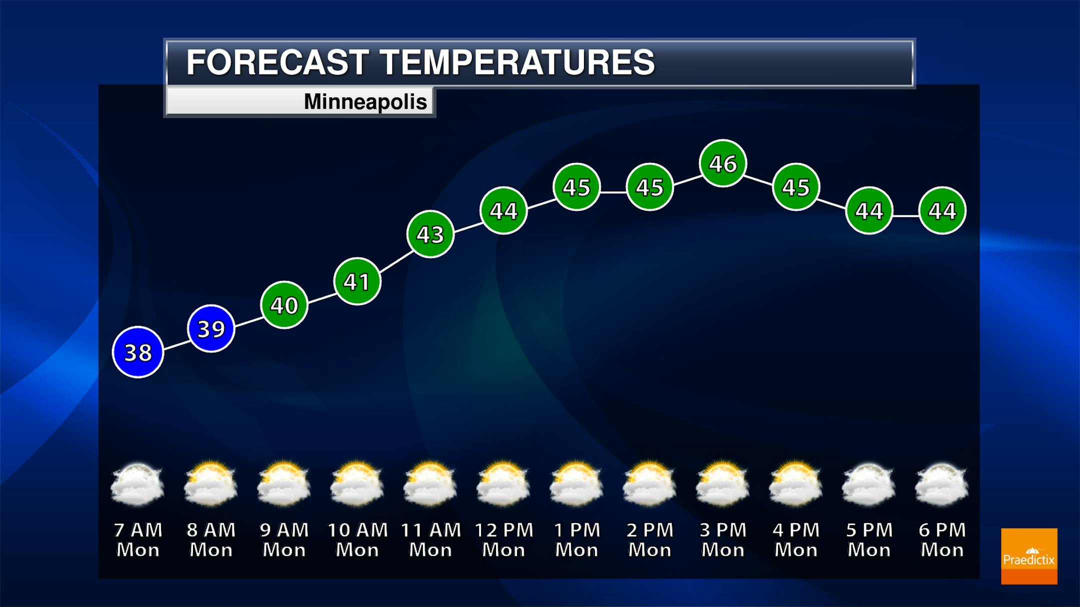 The main thing that the system will bring the metro on Monday will be cloud cover. While an isolated shower or some drizzle can't be ruled out, chances appear minimal. Morning temperatures start off in the upper 30s with highs in the mid-40s. Easterly winds up to 10 mph will make it feel slightly cooler.