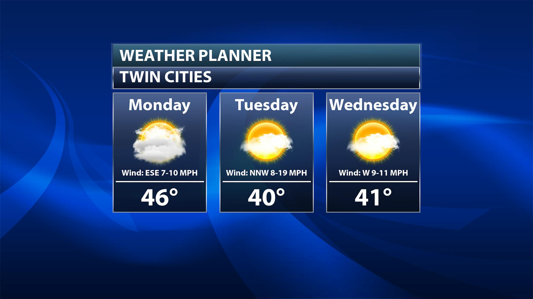 Tuesday: Behind the system that moves through Monday we'll be cooler (highs only in the low 40s) and windier (northwesterly winds gusting to 30 mph by the afternoon hours). We'll likely start the morning off cloudy in the metro, but skies will quickly clear and we'll see a lot of sunshine during the afternoon hours.