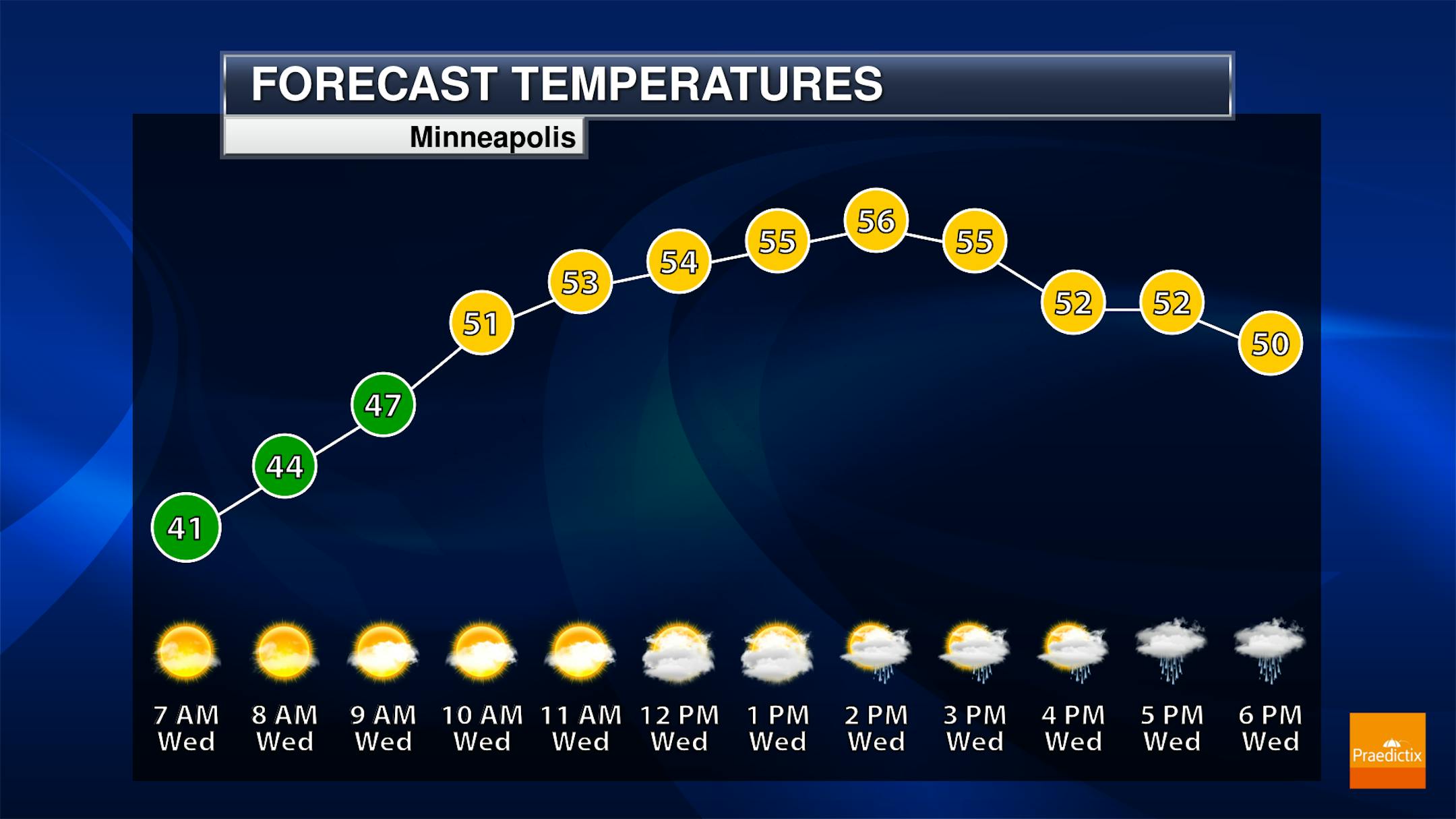 The meteorgrams for Minneapolis on Wednesday show temps warming from the 40s early in the day to the mid/upper 50s after the afternoon hours. Skies will generally be mostly sunny in the morning with cloudier skies late.