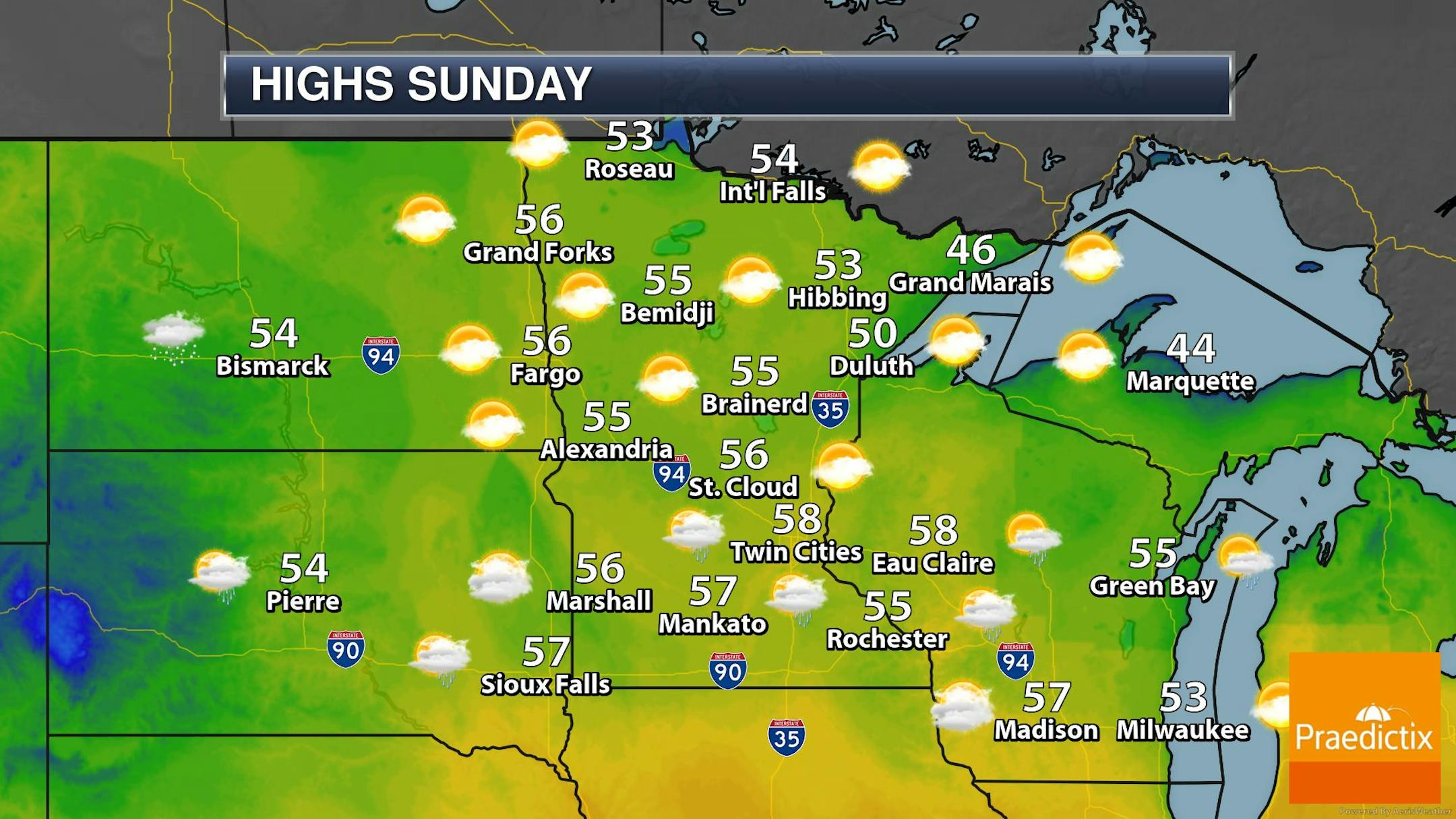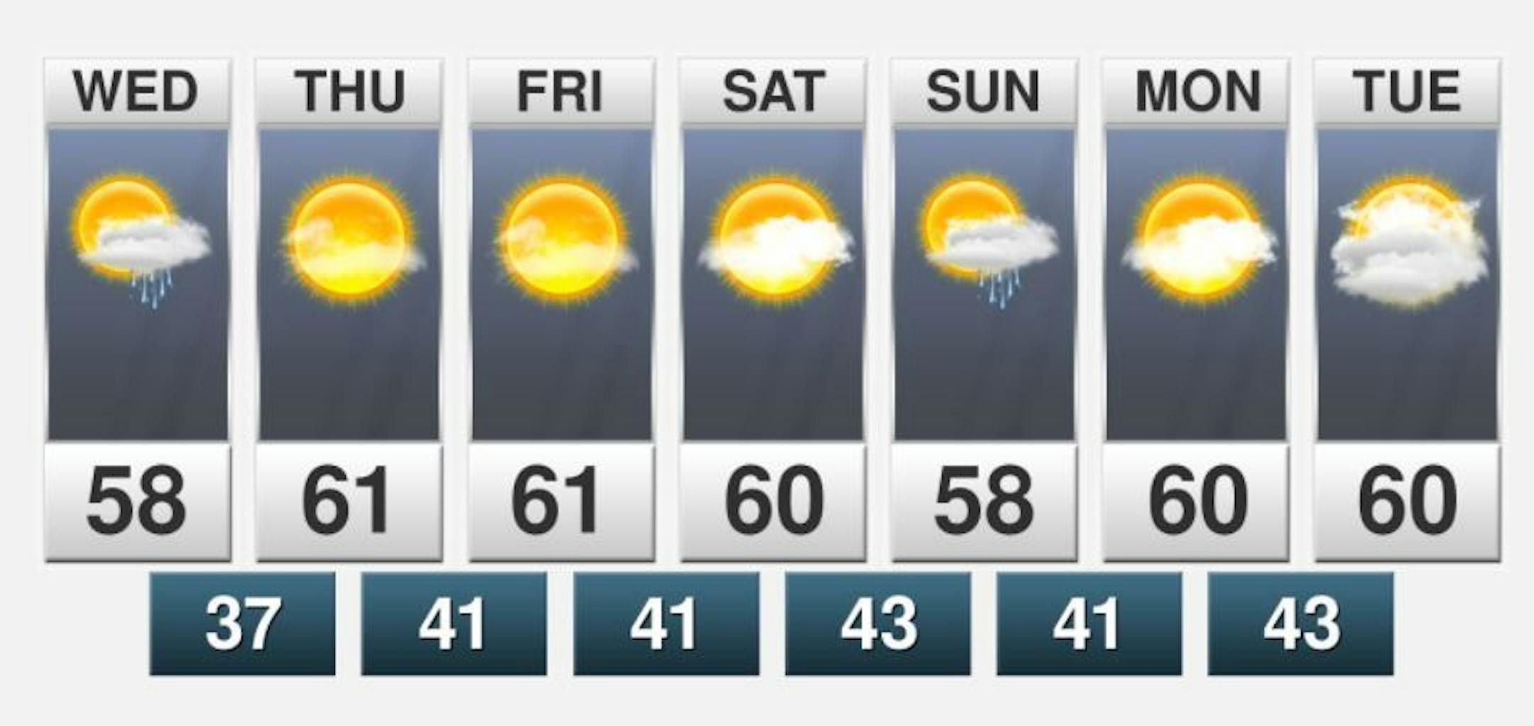 Here's the extended temperature and weather outlook over the next 5 to 7 days in the Twin Cities. Highs on through the rest of the week will be nearly -5F to -10F below average with highs only warming into the upper 50s and lower 60s.