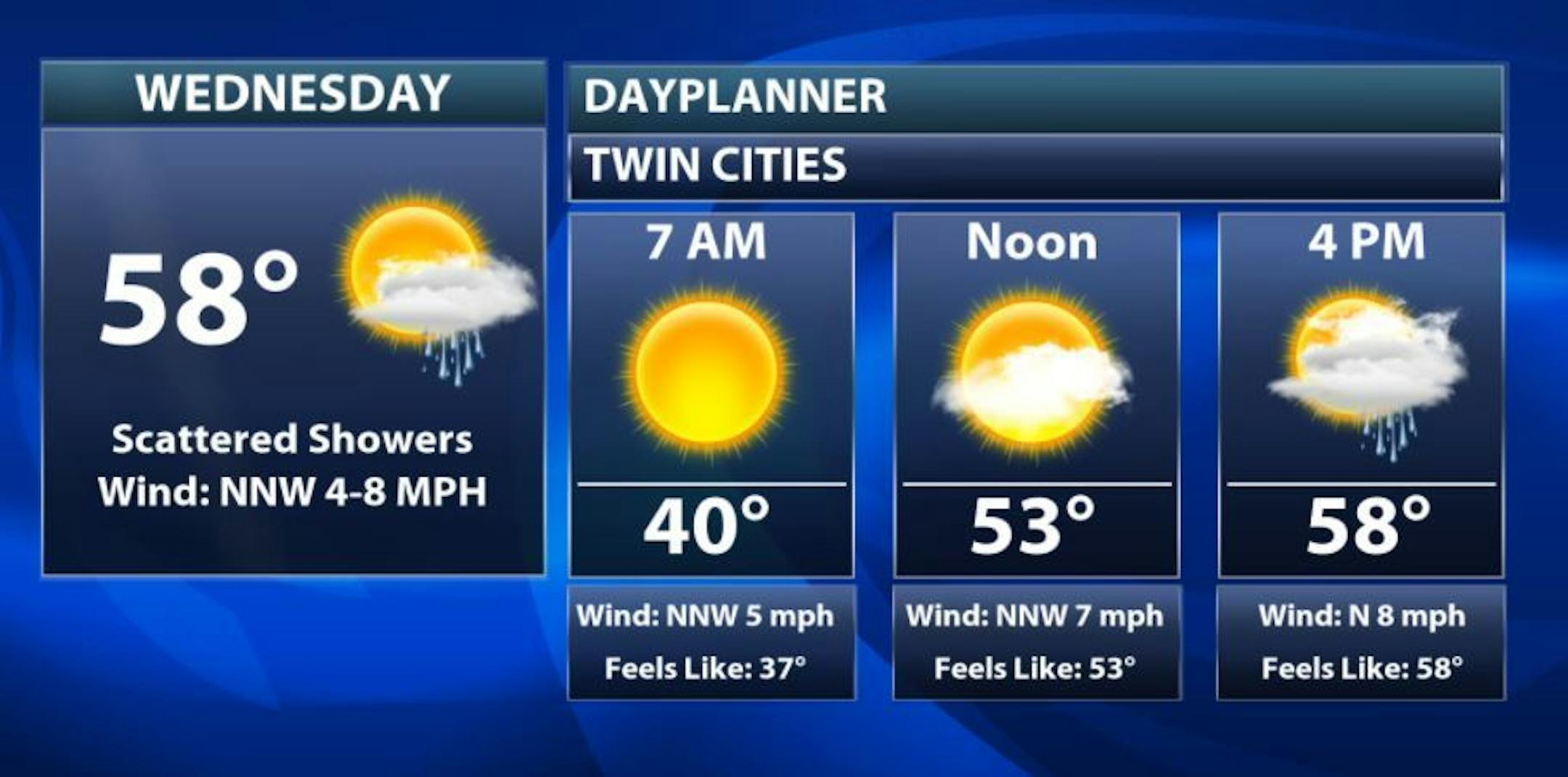 The weather outlook for Minneapolis on Wednesday shows sunnier skies in the morning with showers possible late in the day.