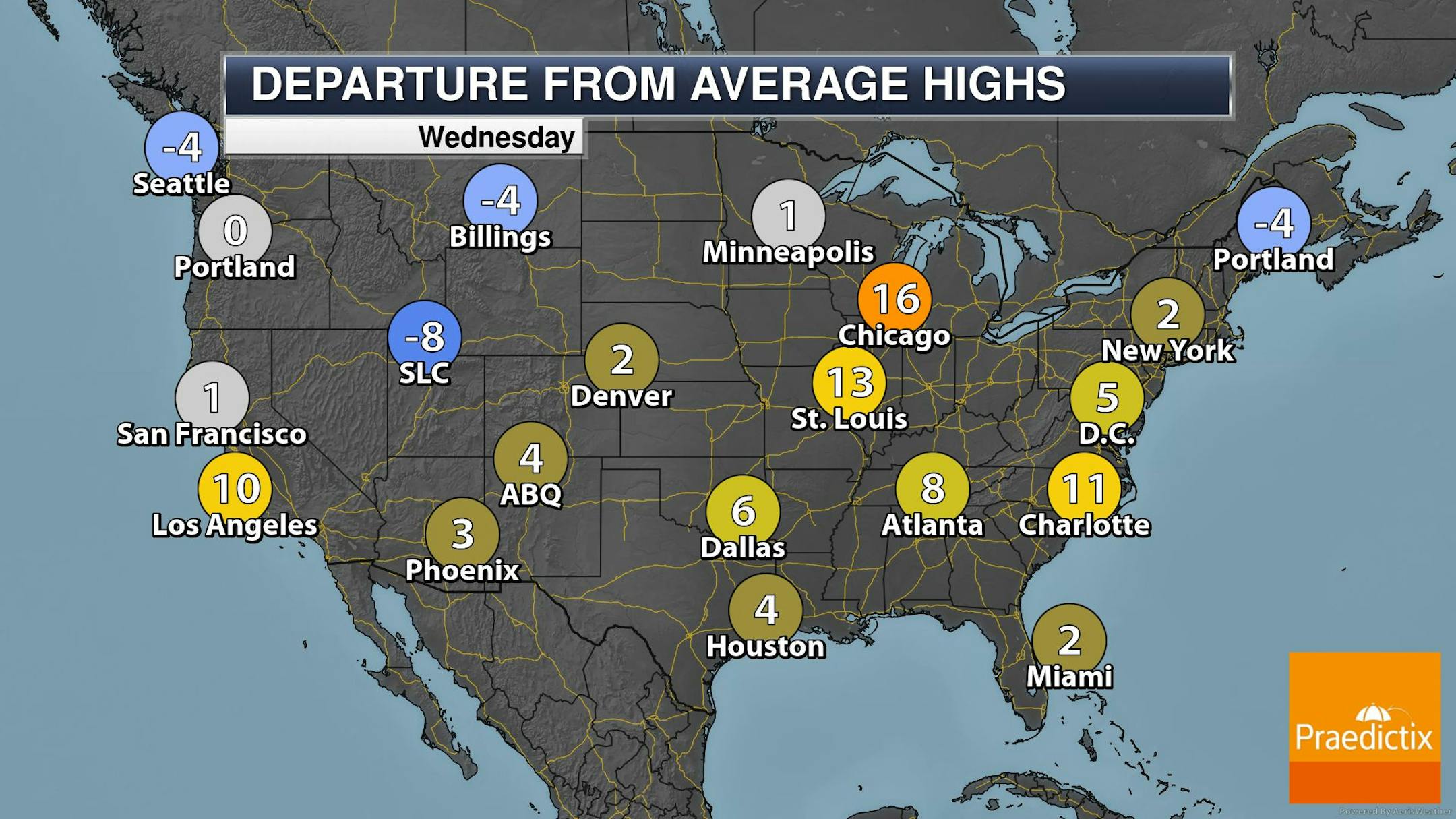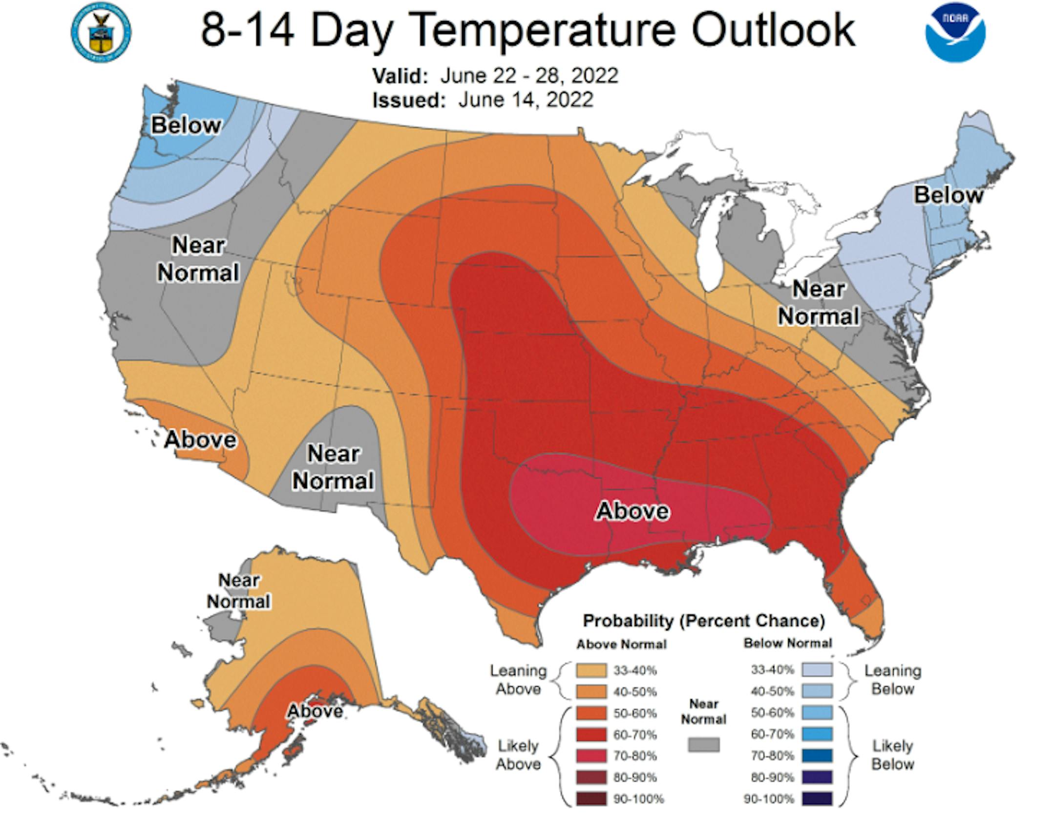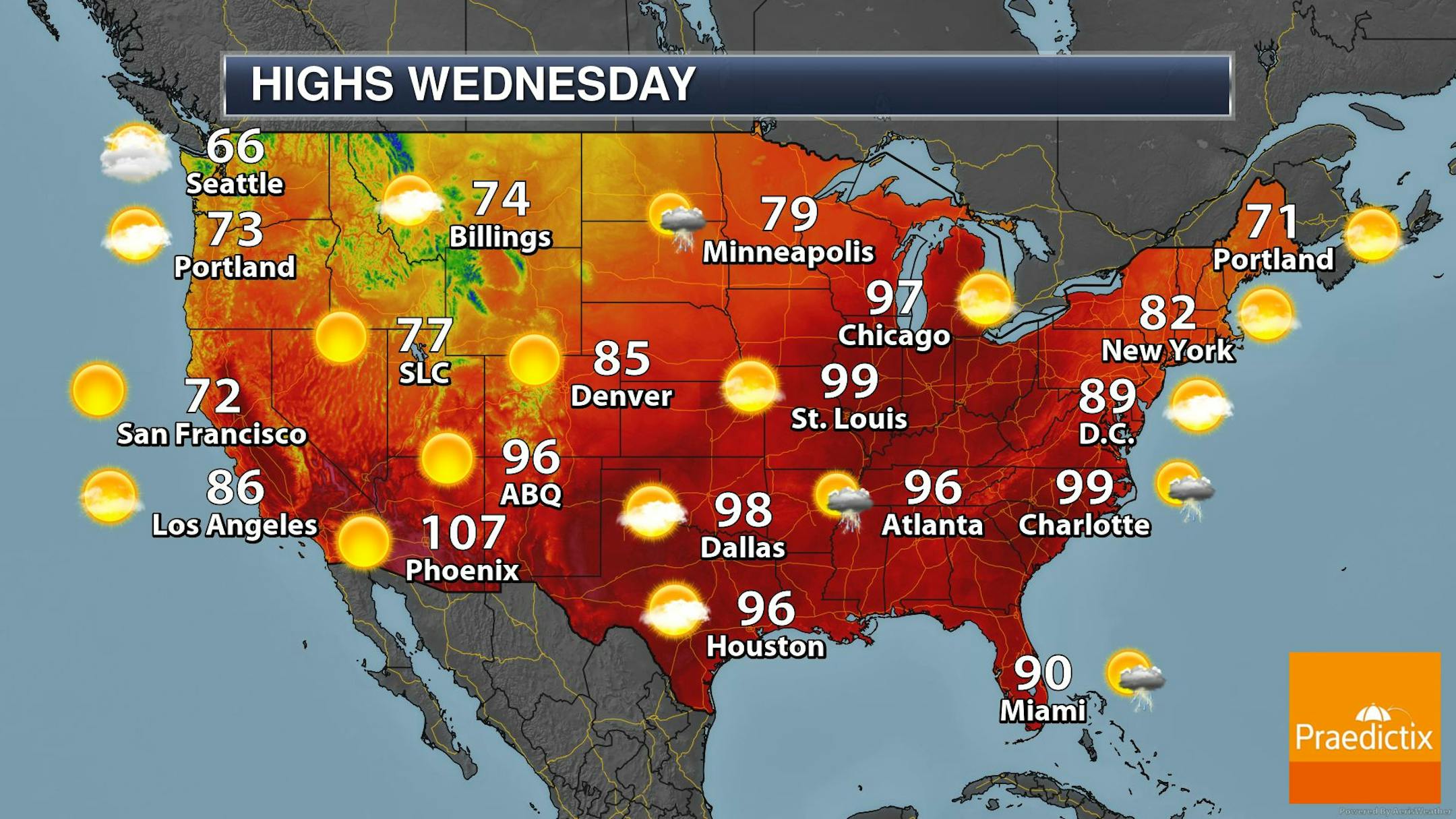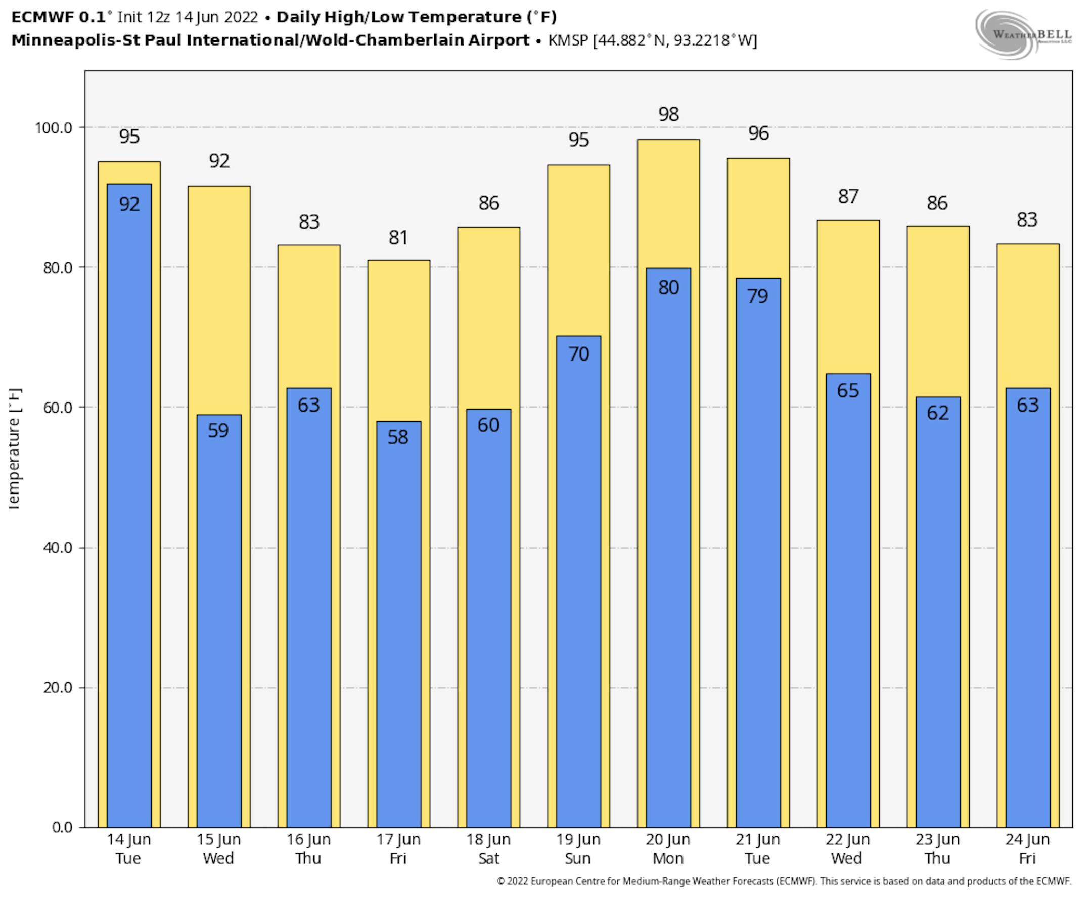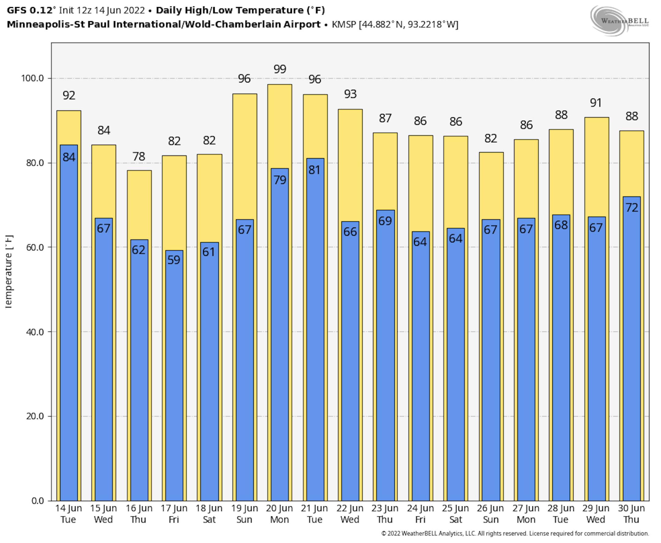 The extended temperature outlook for Minneapolis shows temps closer to average on Wednesday. Temperatures will heat up quite a bit as we approach the weekend. We'll be in the mid/upper 90s by late weekend.