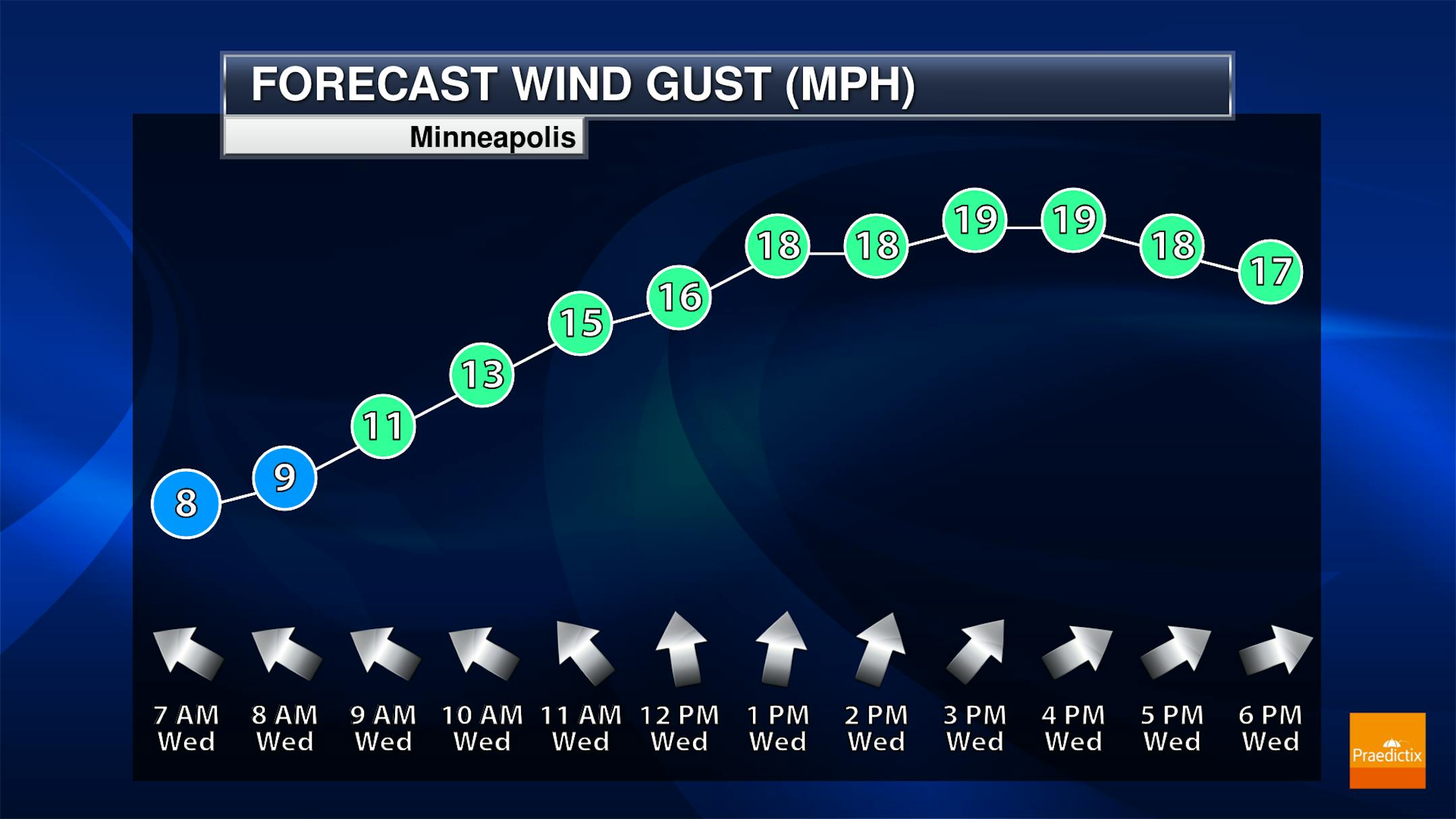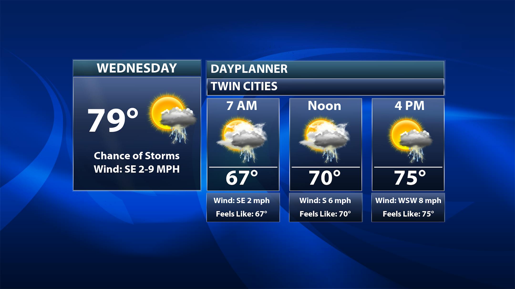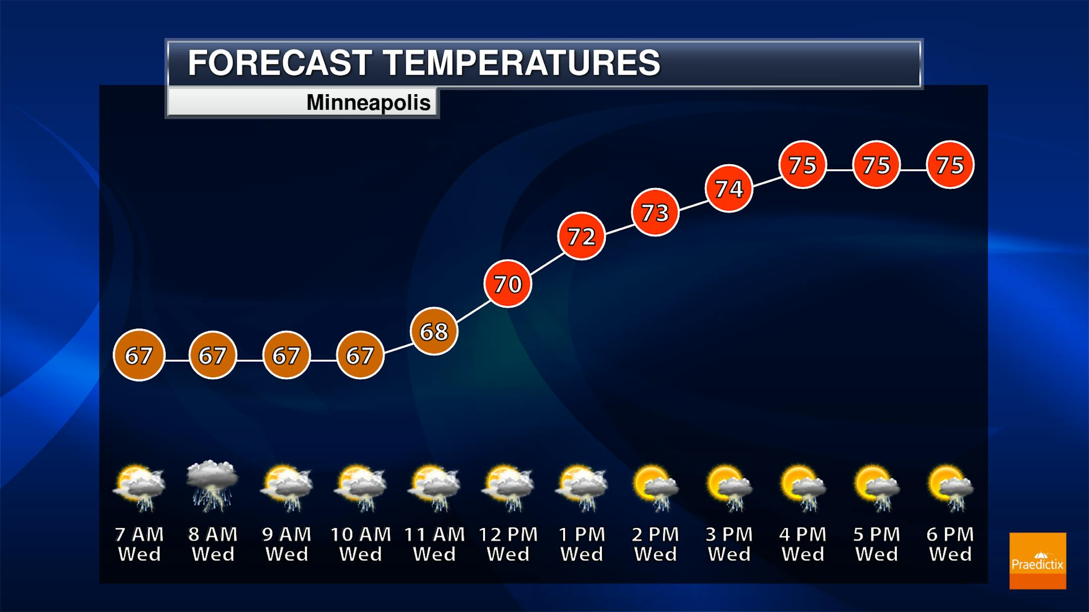 The hourly temps for Minneapolis on Wednesday shows temperatures starting in the mid/upper 60s in the morning and warming into the mid/upper 70s by the afternoon. The best chance of showers and storms will be during the first half of the day. Showers and storms will shift east during the afternoon and evening hours. Southerly winds will be lighter than they were on Tuesday, but gusts could still approach 20mph.