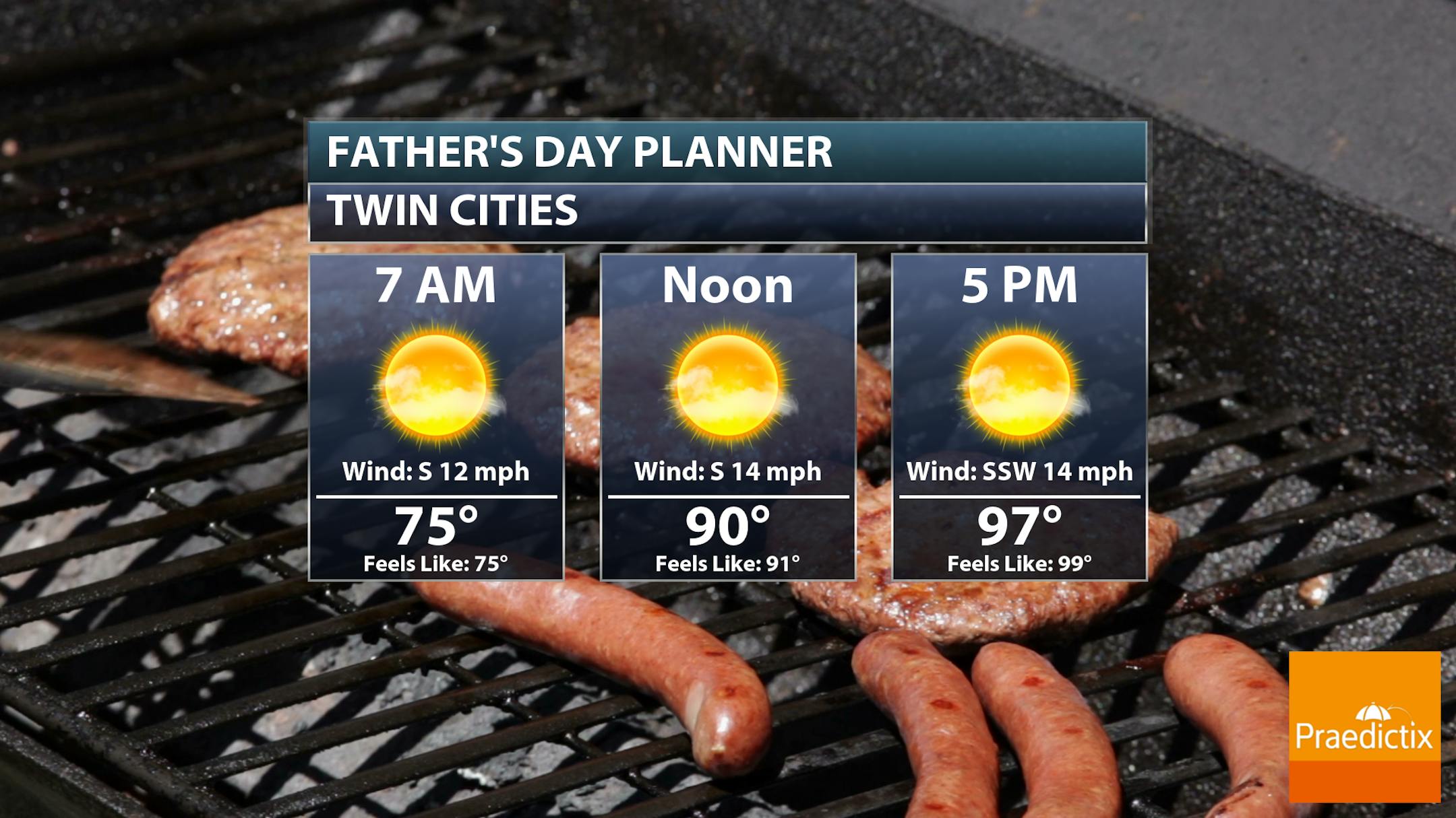 Believe it or not, Father's Day is already this Sunday and it looks like another hot one! Temps will warm into the 90s already by midday, so those outdoor afternoon BBQs will be quite hot. Make sure you find some shade and drink plenty of fluids. Happy Father's Day to all the Dads out there!