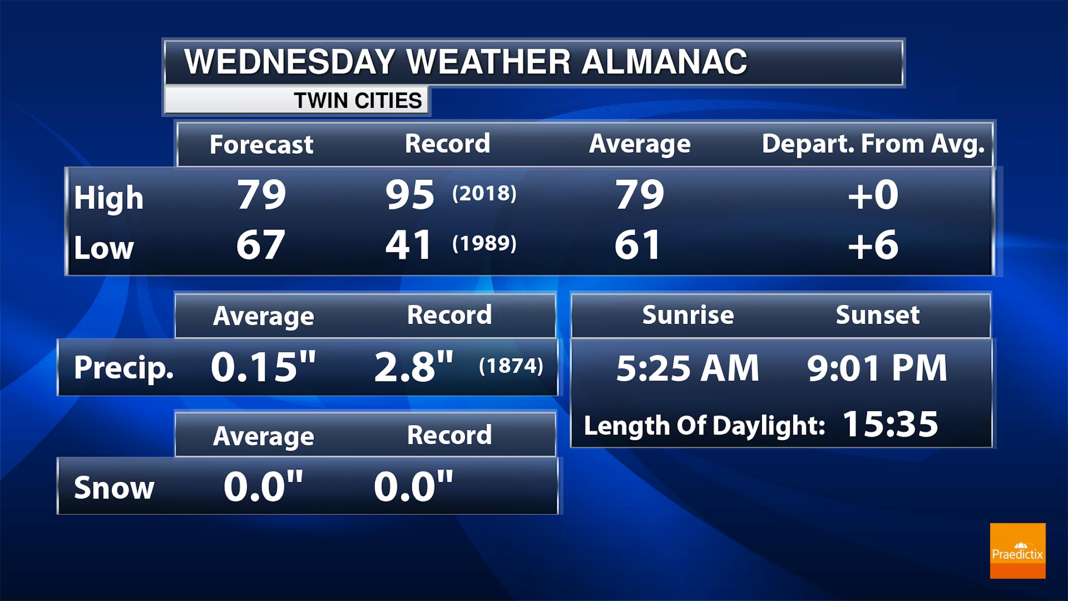 Here's the weather outlook from AM Wednesday to PM Sunday. After a hot Tuesday, showers and storms will be possible Tuesday night into Wednesday. The best chance of strong to severe storms will be mainly south and east of the Twin Cities. The rest of the forecast period appears to be mainly dry with a few chances of rain across northern Minnesota.