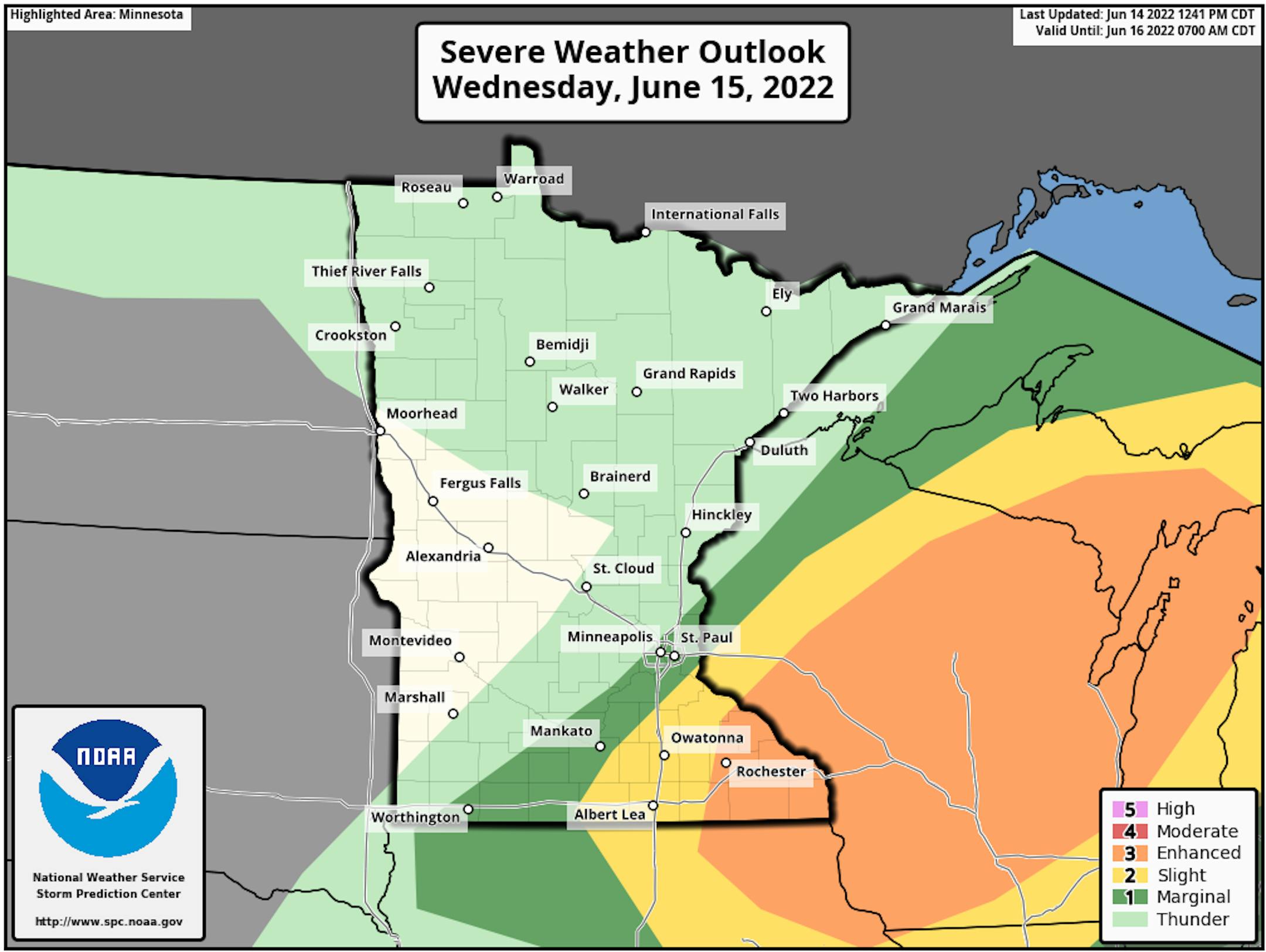 According to NOAA's Storm Prediction Center, there is a risk of strong to severe thunderstorms across southeastern Minnesota and into Wisconsin. Large hail, damaging winds and even tornadoes will be possible, especially in the orange, Enhanced Risk area.