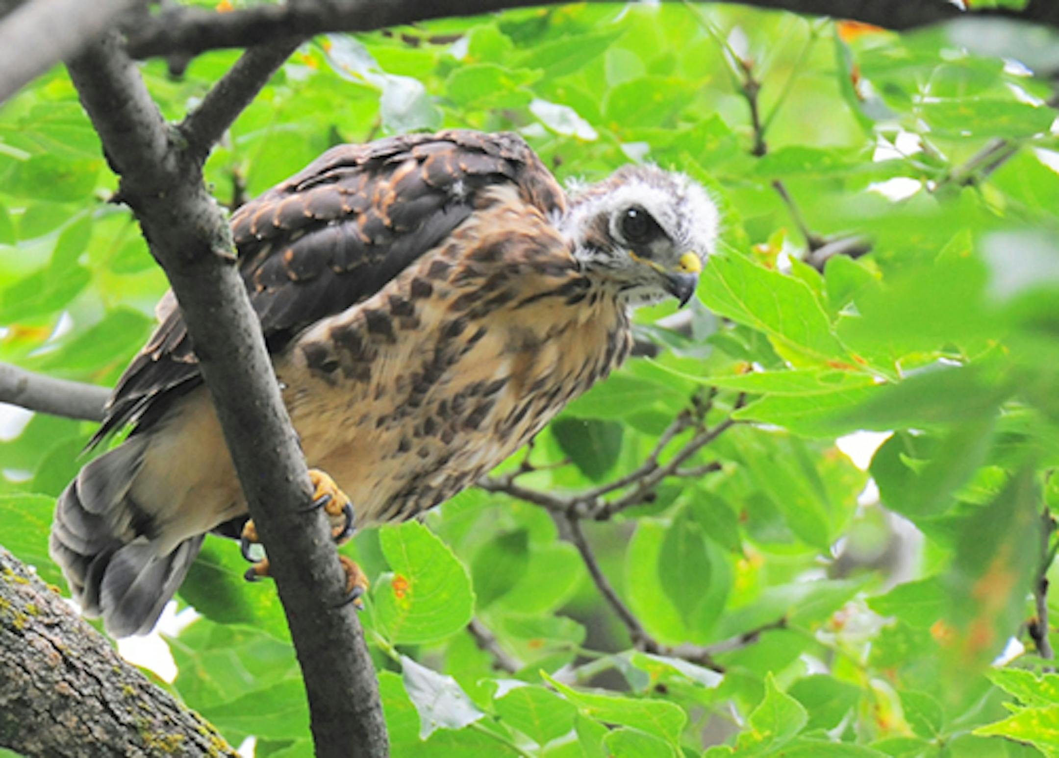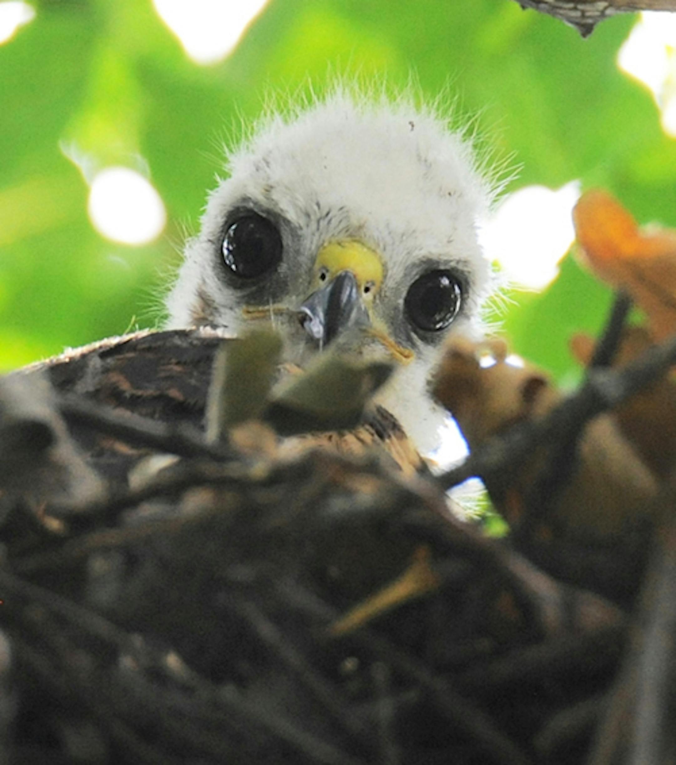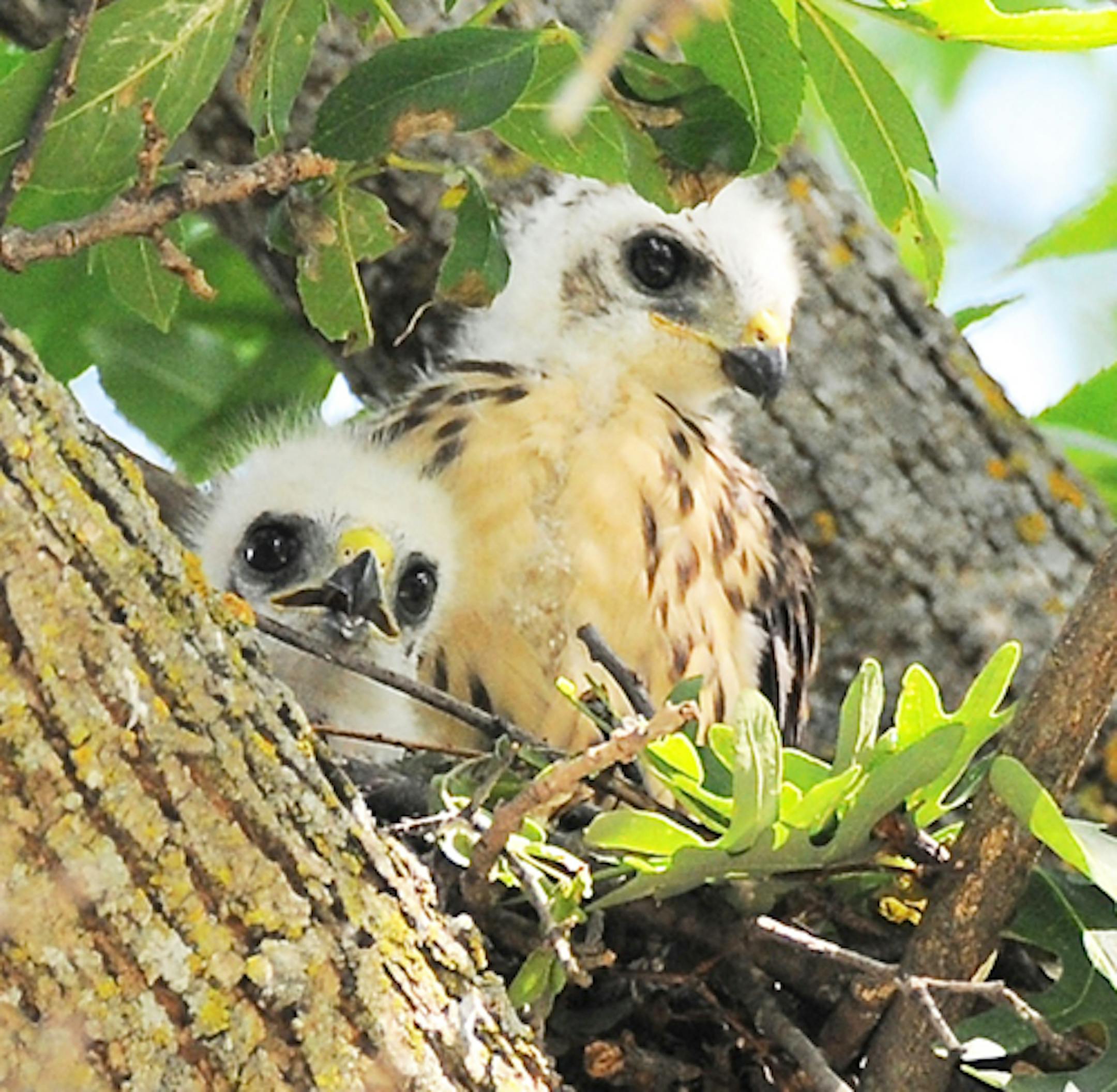 We've had Cooper's Hawks nests in years past in neighbors' yards both left and right. The nests always were positioned to make viewing near impossible. This year, though, a pair is nesting next door to one of our daughters, and the view is great. I should have been there a couple of weeks ago, the better to watch the young birds grow. The birds left the nest on July 8. As chicks, each of the three was a different size — small, medium, and large. The latter had left the nest, spending its time on a branch about three feet above its siblings. It needed to replace fuzzy white head feathers with the stripes of a juvenile, and fill out plumage on its breast. But for that it looked fierce and ready to hunt. I've waited at a distance to see adults come in with food, but no luck so far. A grandson has seen one of the adults deliver a squirrel to the nest. Checking weights of both predator and prey, both weigh a pound, give or take. I was curious about the amount of weight with which the bird can fly. The juveniles are occasionally fed by their parents at this point, but soon will be looking for their own squirrels.