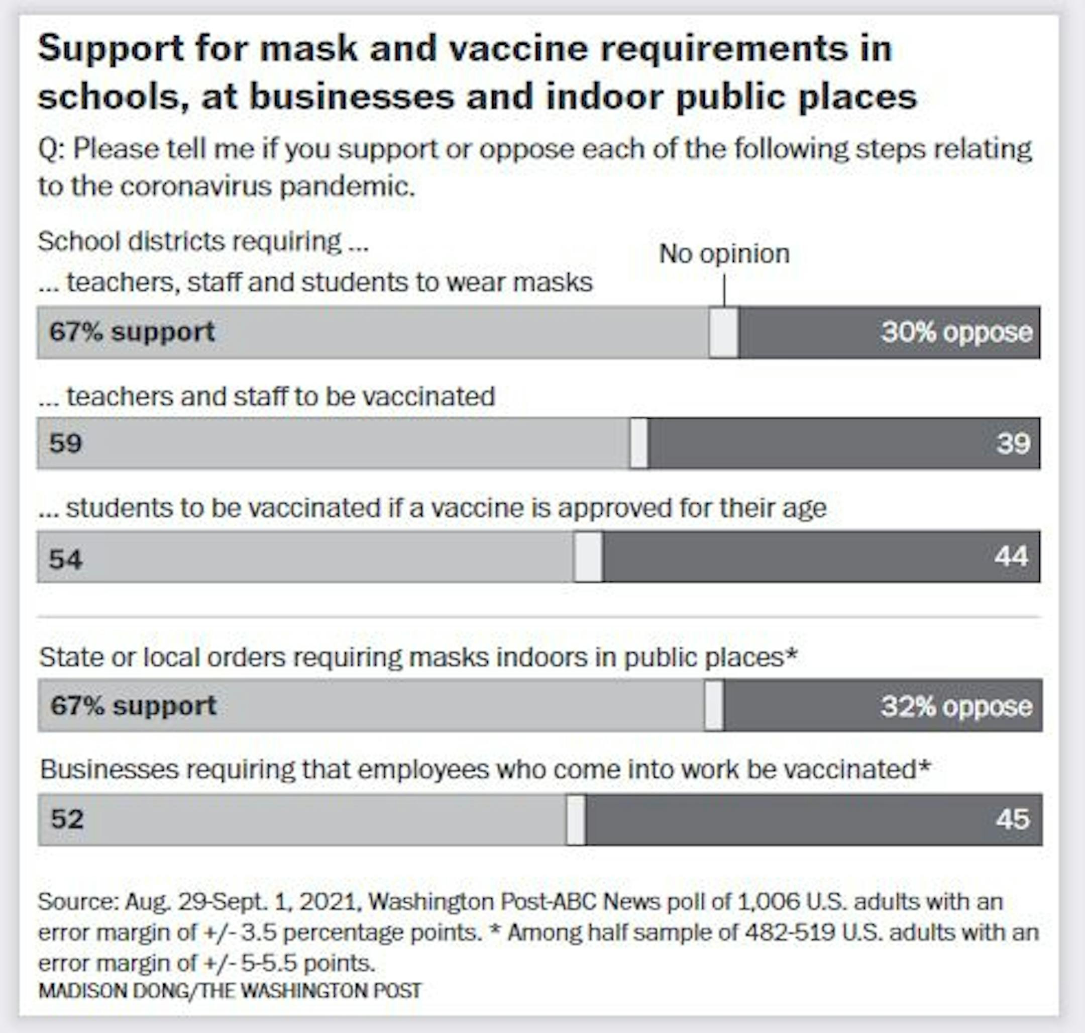 The Post-ABC poll finds 52% of Americans support businesses requiring employees who come into work to be vaccinated, with support dipping to 47% among workers who are not self-employed. Roughly 8 in 10 Democrats support vaccine mandates for workers, while more than 6 in 10 Republicans are opposed. Independents are divided nearly down the middle.