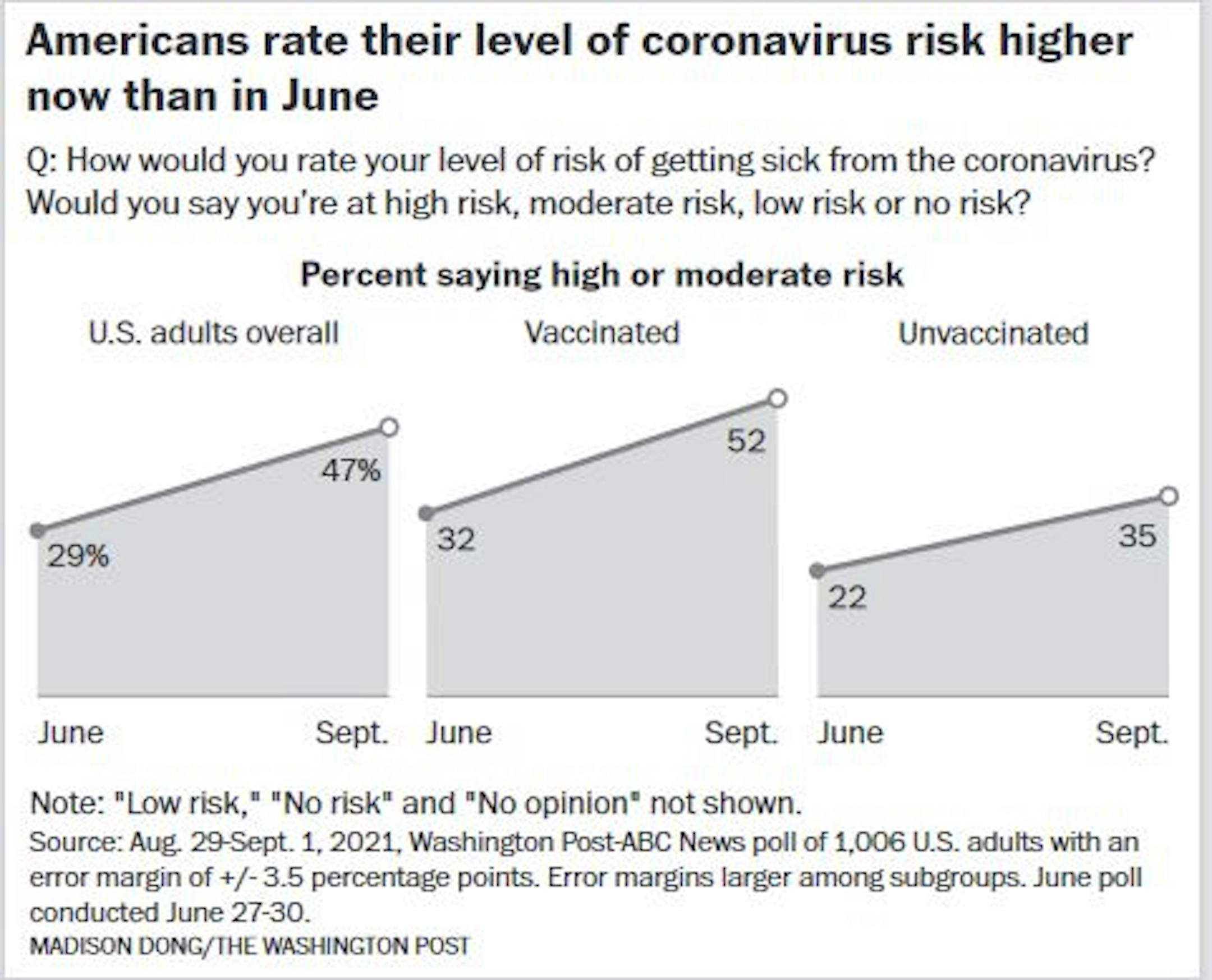 Nearly half of Americans, 47%, rate their risk of getting sick from the coronavirus as moderate or high, up 18 percentage points from late June. This follows a more than tenfold increase in daily infections. Concerns over catching the virus among partially or fully vaccinated adults have risen from 32% to 52%, while concern among unvaccinated adults has grown from 22% to 35% over the same period.