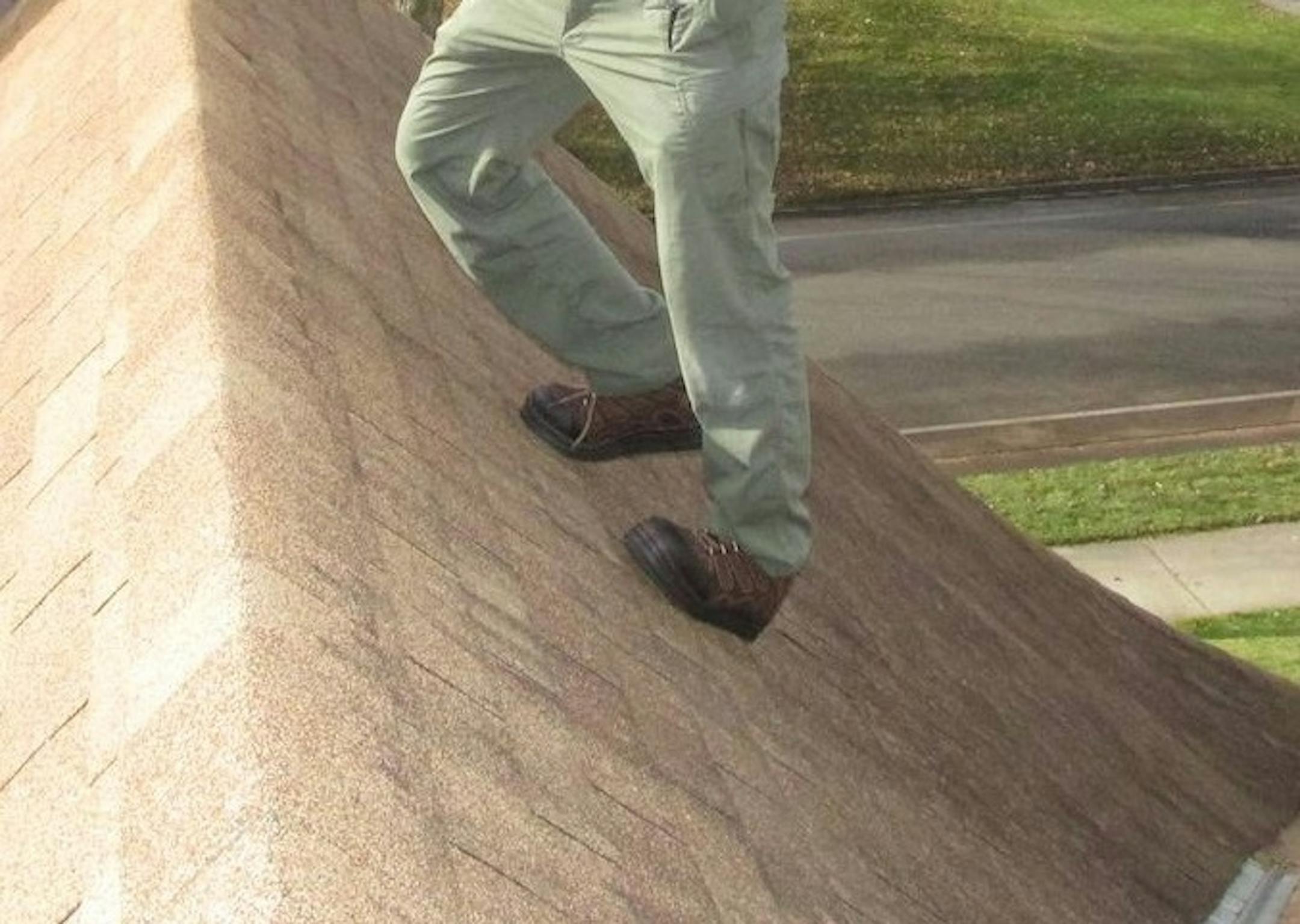 For anyone in any type of business who regularly walks sloped roofs, I recommend getting a pair of boots that are made for the job. They're called Cougar Paws, and they're not your everyday work boot; they're designed specifically for walking sloped roofs, and the bottoms are made from the same stuff that Spider-Man has on the bottom of his feet.