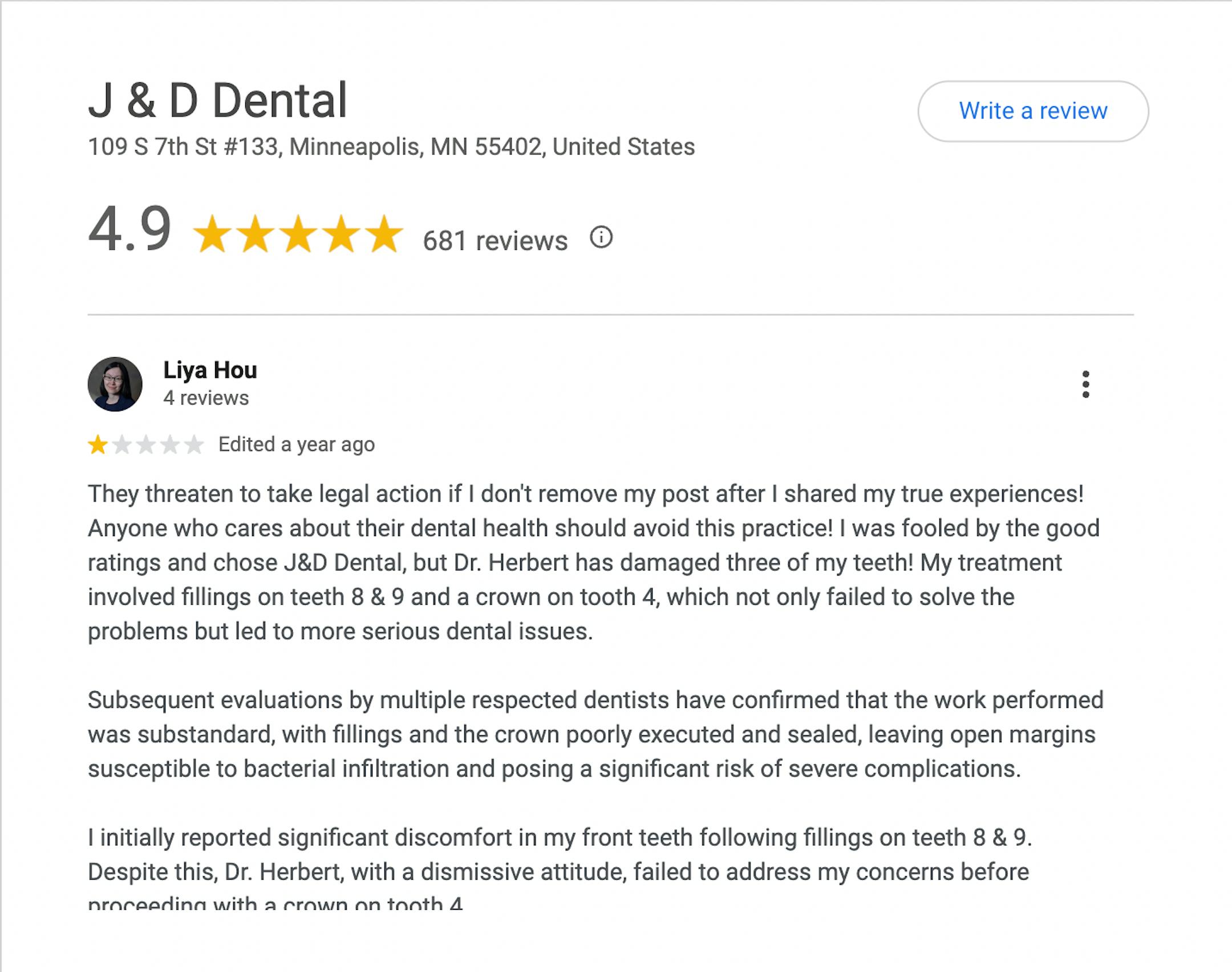 Before the postings, Hou, of St. Cloud, had two fillings and a crown done at J&D Dental. Afterward, she started to feel discomfort and went to another dentist who said the work needed to be redone. J&D Dental questioned her version of events and sought more information about the damage. During this time, Hou engaged J&D Dental in conversation over what could be done to remedy the situation.