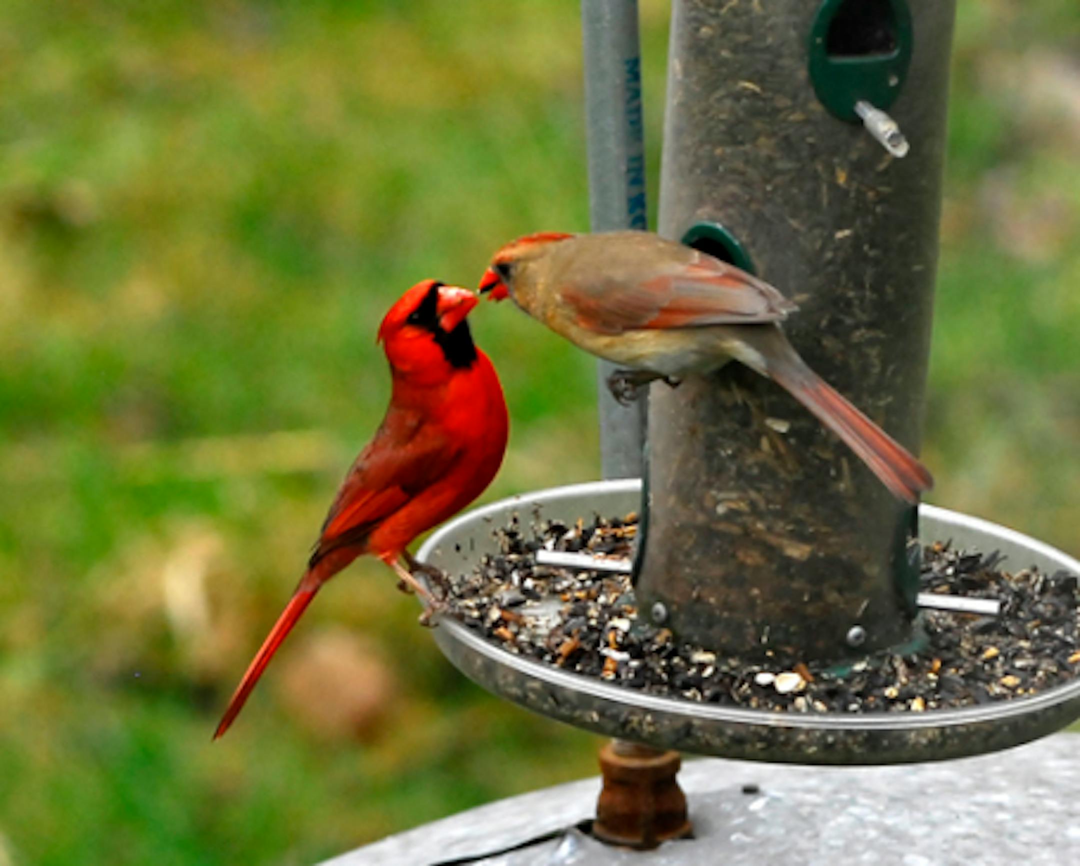 Male birds of many species feed the female they are courting as part of the pair-bonding function. The purpose is to create and maintain the strong relationship needed for breeding, nesting, and raising young. Research also suggests that females who receive more food in this fashion lay larger clutches. Here, a pair of Northern Cardinals exchange a sunflower seed on a feeder in our backyard. It looked to me as I watched this for a couple of minutes that the female was the one passing the seed to the male. She has it in this photo, and the male eventually opened his bill to receive it.
