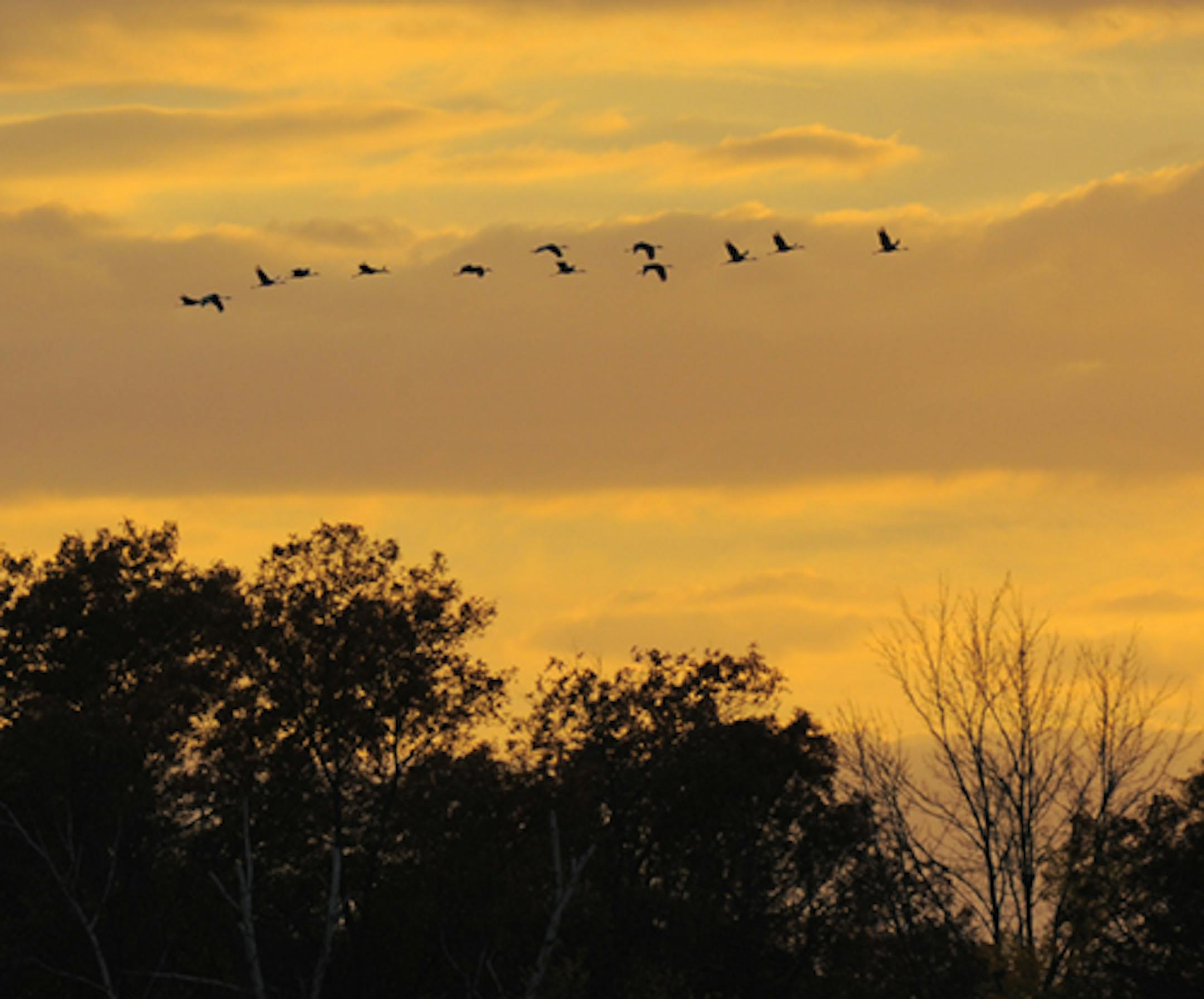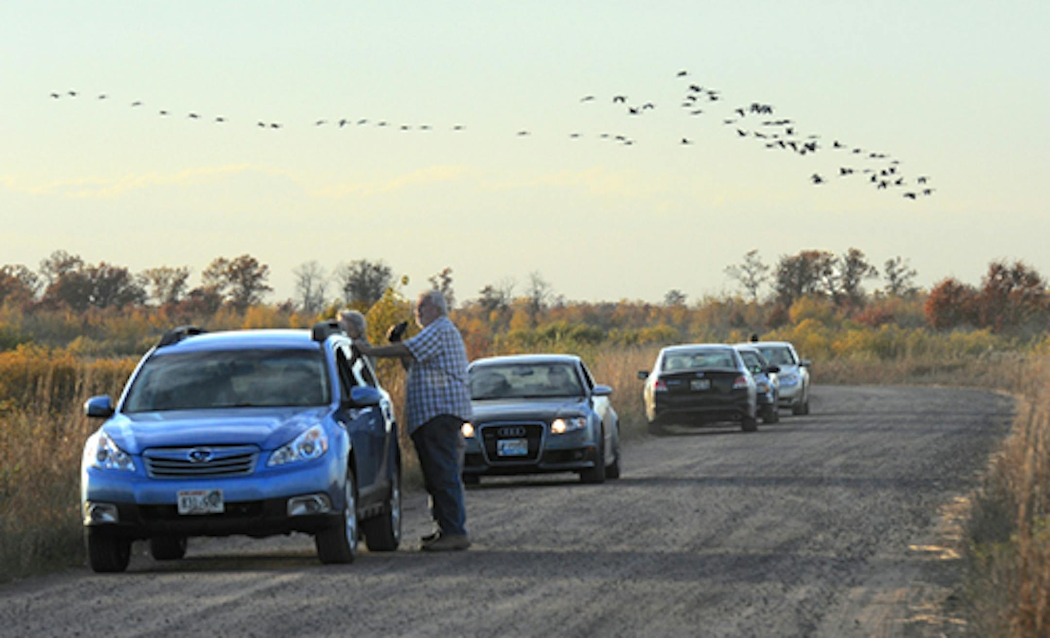 Grantsburg is a 90-minute drive from downtown Minneapolis. Take I-35W north to Minnesota Highway 70, four miles north of the Rush City exit. Follow 70 east across the St. Croix River, and then into Grantsburg. Turn left at the light. Follow the crane silhouettes painted in yellow on the road. The birds are expected to remain in the area into early November.