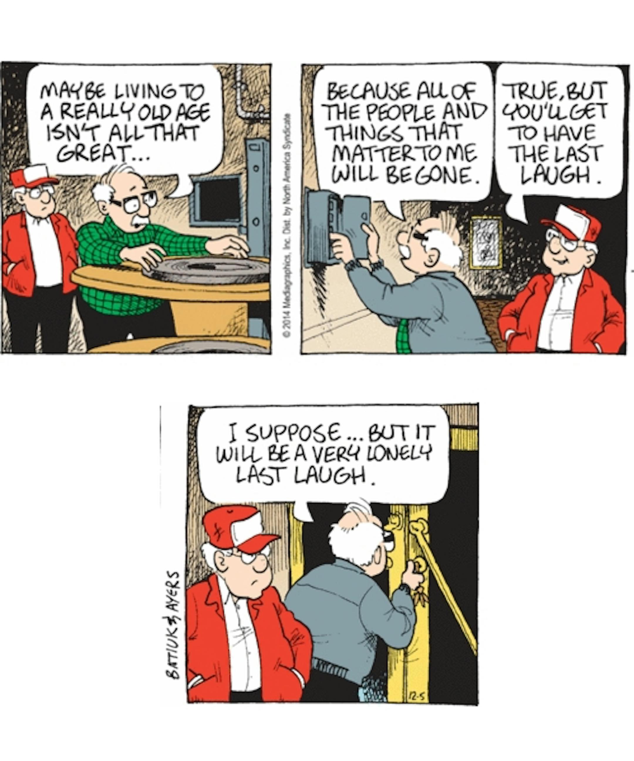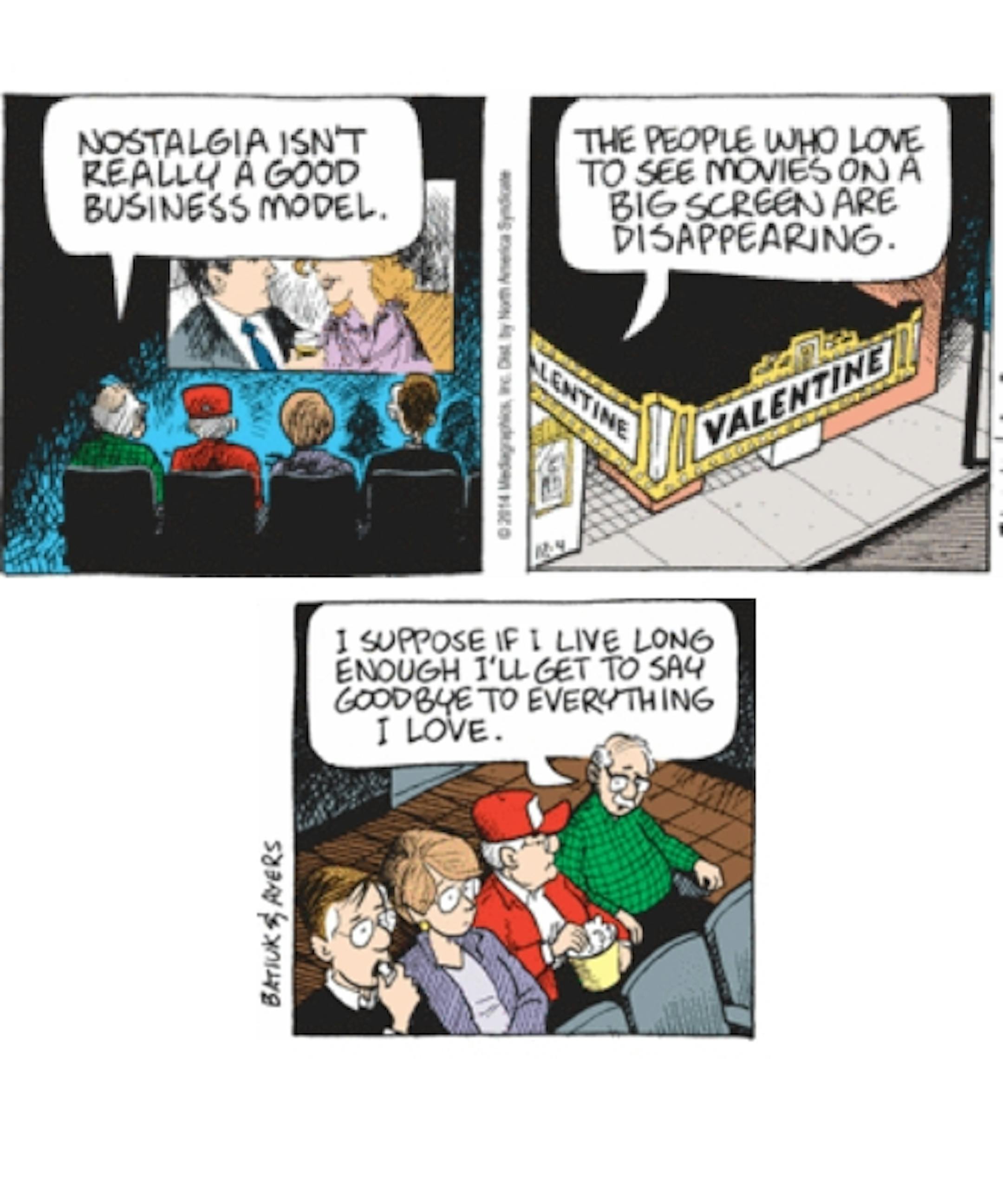 Crankshaft takes place about twenty years in the past, according to Wikipedia. When it suits the comic's purposes it lurches into the modern world so we can chuckle along with the nasty old misanthropist's attempt to comprehend technology. (Note: by "chuckle" we mean stare stone-faced at the drawing before moving on to Pearls Before Swine.) LAst week's strips seem to be playing with the timeline, as the local movie house is forced to close because studios are switching entirely to digital projection.