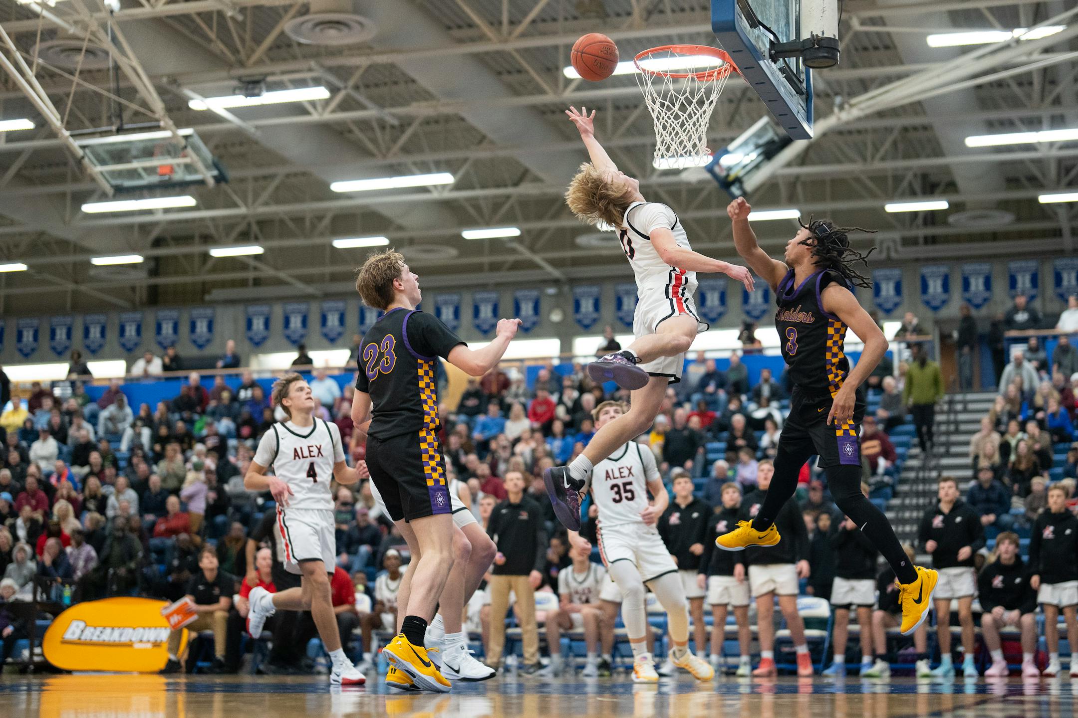 Alexandria 6-8 forward Chase Thompson gives a quick jab step with his right foot, getting Cretin-Derham Hall 6-10 senior Tommy Ahneman to backpedal slightly off balance. It gives Thompson plenty of room to bury a 22-foot three-pointer.
