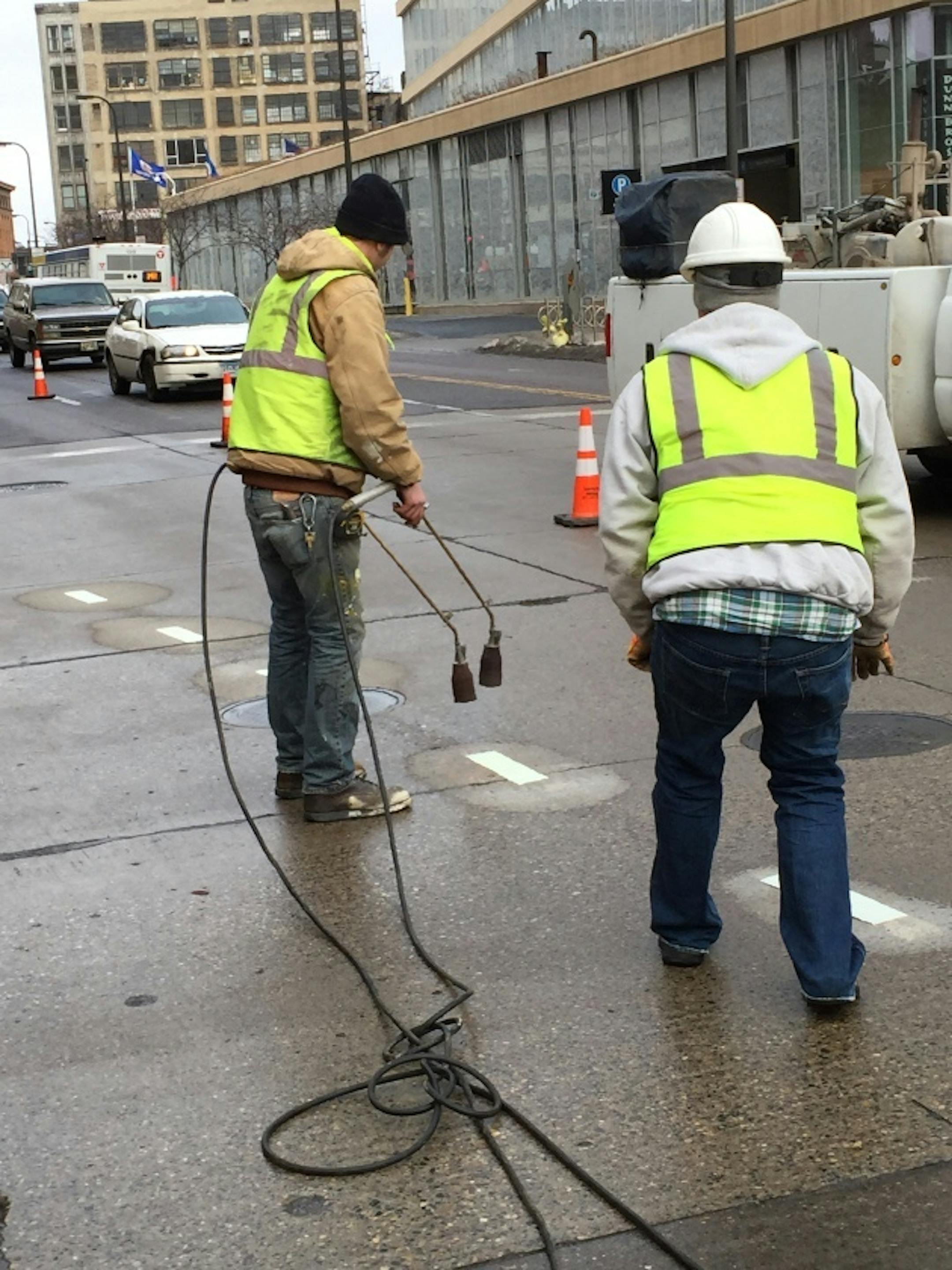 Crews from Opus Group took advantage of Monday's unseasonably warm weather and a blow torch to redo lane markings on section of 4th Street in downtown Minneapolis where lines designating a lane shift had worn off leaving many motorists wondering where to drive.