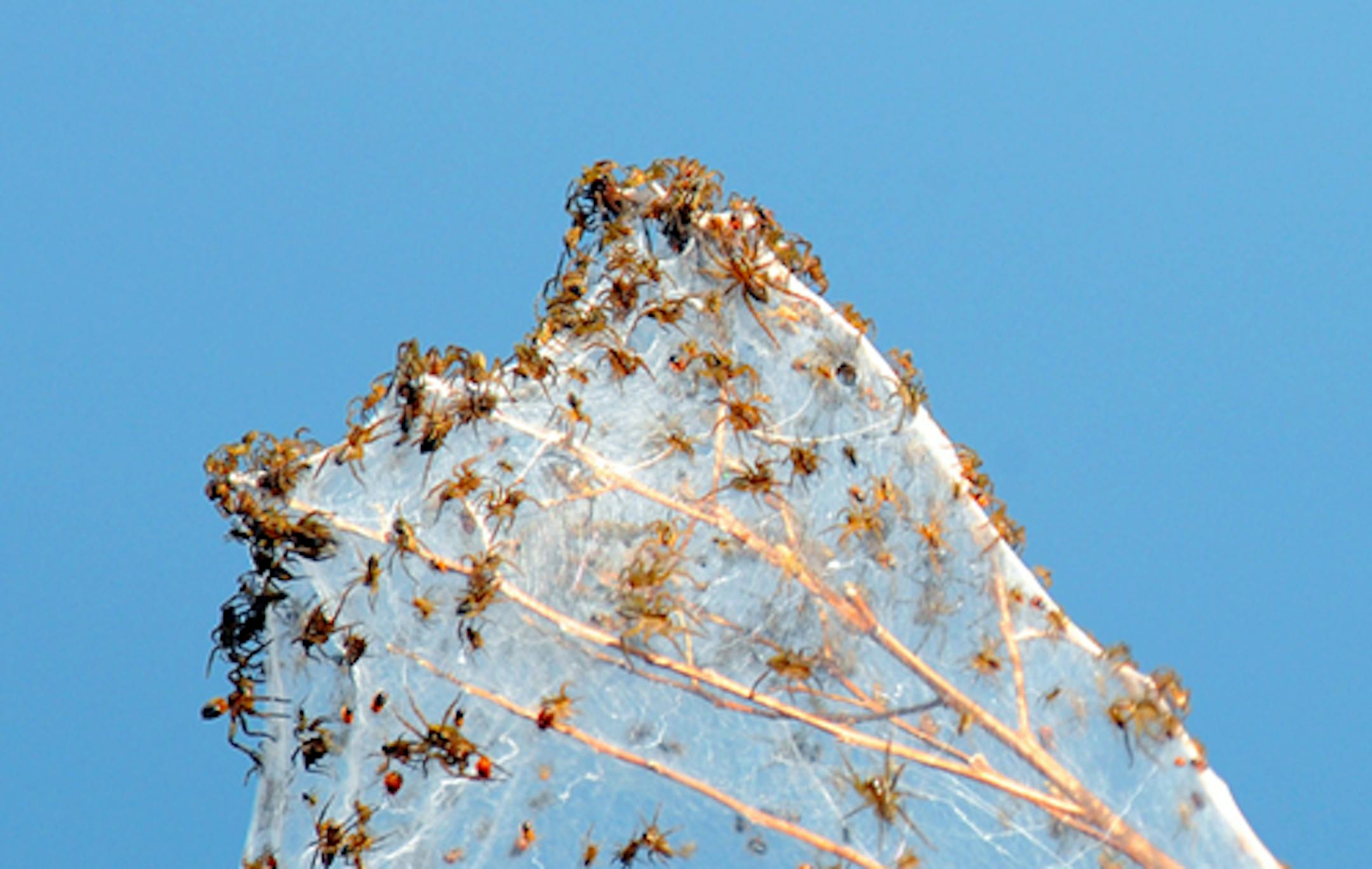 We also saw tens of thousands of spiders spread along 150 yards of webbing stretched from weed stems along Pump House Road at Crex. Very strange. If you got too close, as I did, they ran up legs and onto neck and hair. Not good. Larger ones were the size of pennies, the smallest maybe an eighth inch.