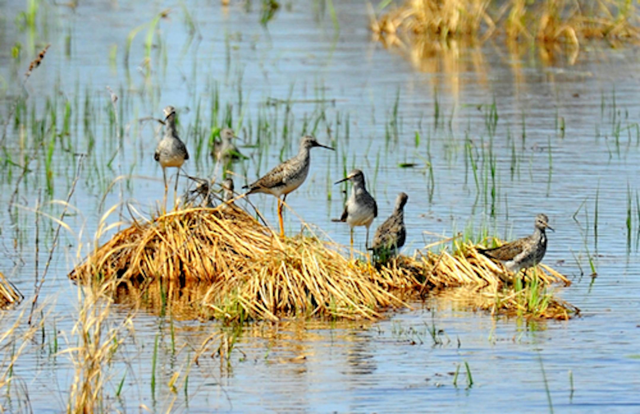 The teal in the Garganey pond (County Road F and Abel Road) put on the best show waterfowl yesterday. Warblers were thin, just one location I would call good. There were few shorebirds, this collection of a dozen yellowlegs being the best we saw. We did find six garter snakes, five painted turtles, one snapping turtle, and a bat, all important to an 12-year-old a who loves those creatures along with birds.