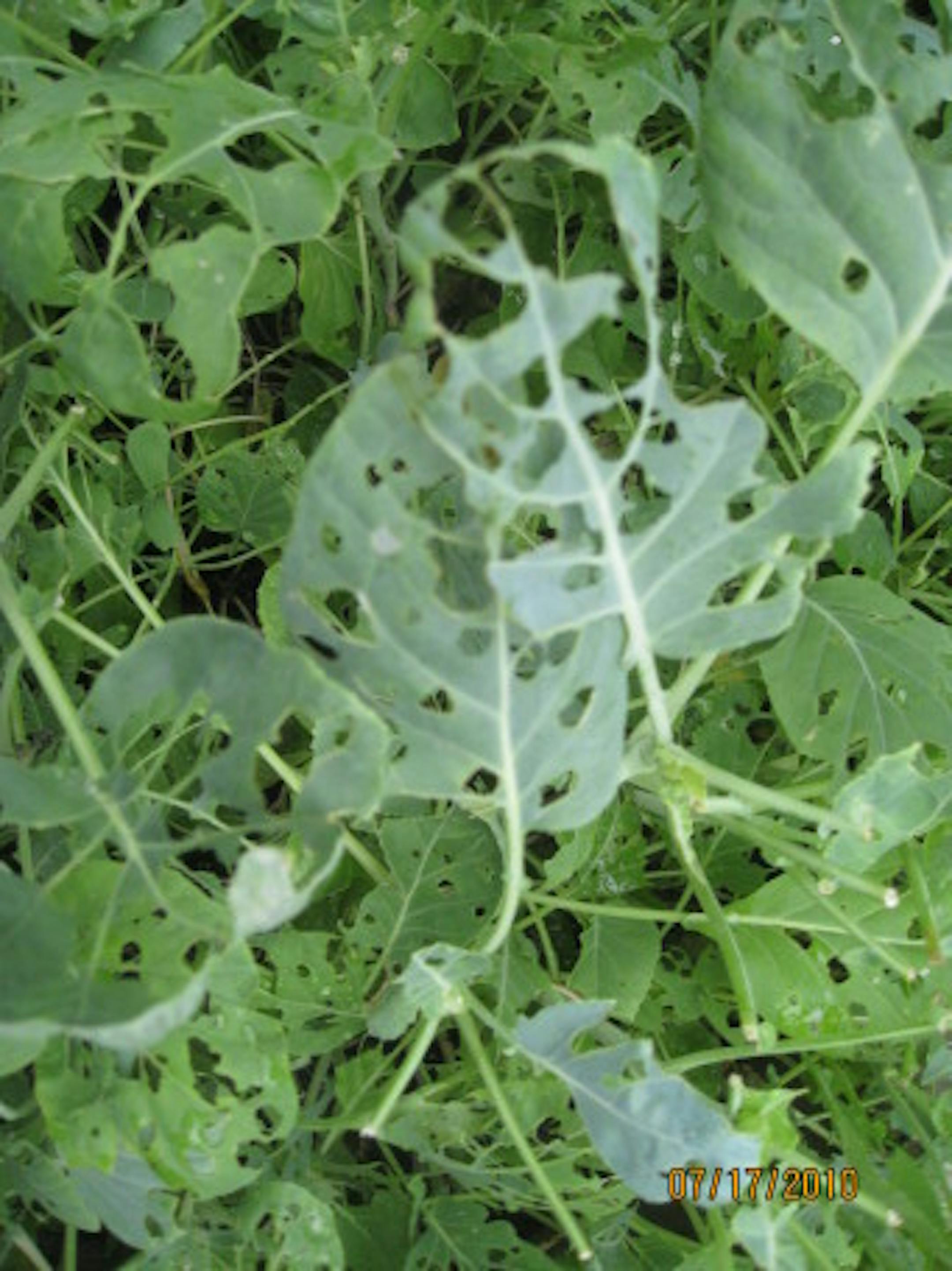 When I got home that night, I went to look. Yikes! ALL the leaves on every plant were now dotted with holes. I looked at the leaves' undersides, and sure enough, there were several tiny green worms, barely visible against the same-colored leaves. I plucked them off and threw them as far as I could.