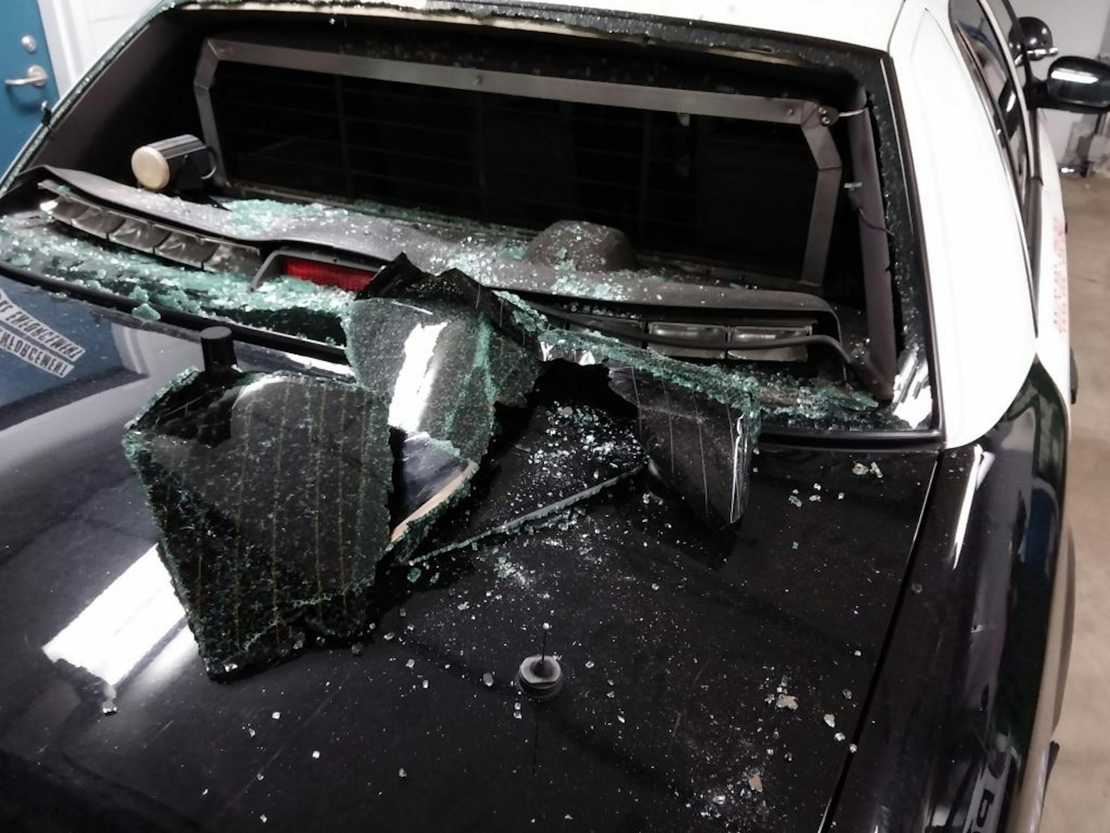 Video surveillance shows a suspect entering the parking lot from the northeast corner and walking toward the K-9 squad car. The individual approached the vehicle quickly and threw the brick, smashing the back window of the car, a news release said.