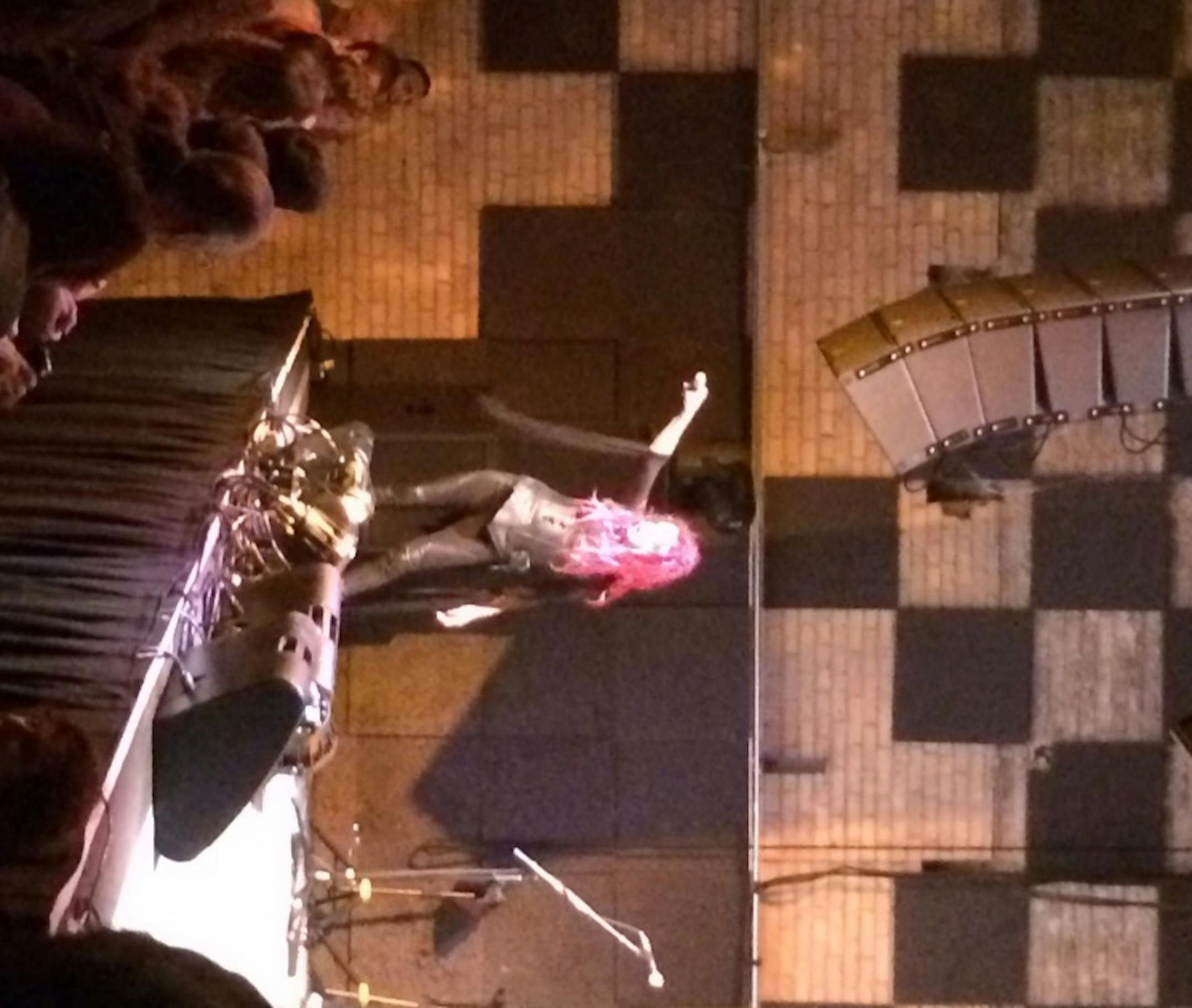 "Can you believe I have the balls to sing this with my combat boots on?" she cracked. "But they do have a glitter on them."