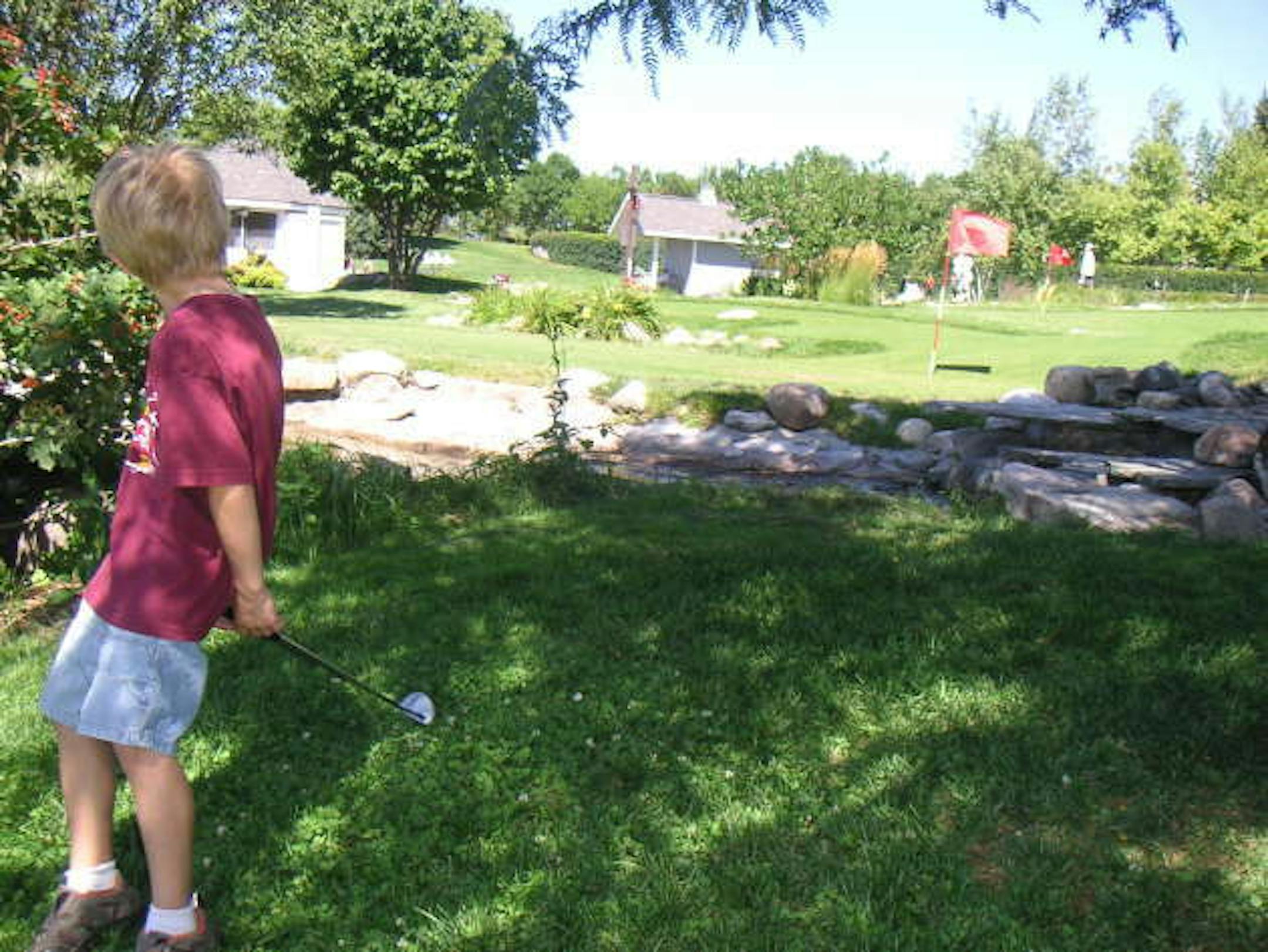 My younger son has loved golf as long as I can remember, though my memory is not so good because he hit me in the forehead with a 3-wood about 5 years ago. I bled through my pores, but that's a story for another time. It's a beautiful day to hit the driving range! You should be able to get a bucket of balls for about $5 at your local golf course. Call ahead to make sure they have a set of kids clubs that you can borrow (our course loans them for free) and then swing away. Just make sure there's plenty of space between your head and their clubs. Down the road, after you feel at home on the range, you can find a family course to take your skills onto the links.