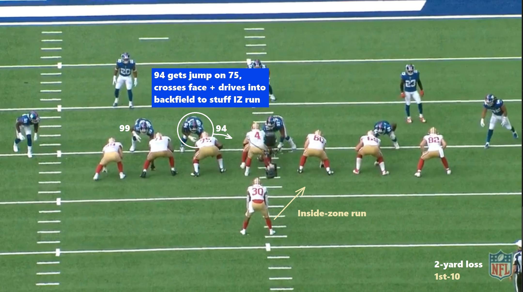 Tomlinson and Leonard Williams (#99) collapse the back side of this inside-zone run by San Francisco.