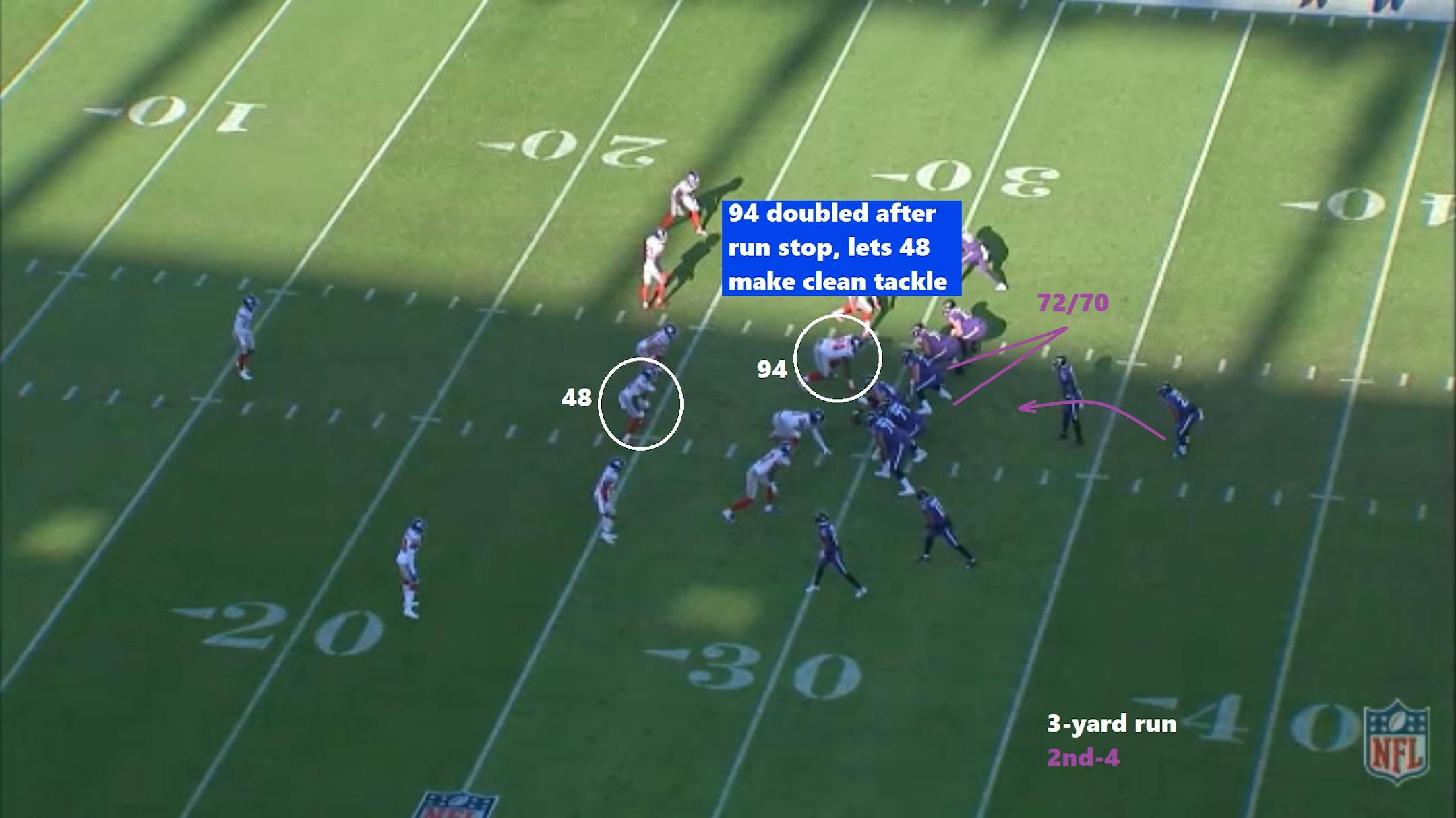 On this first down, Tomlinson (#94) not only gets the quick jump on 49ers left guard Laken Tomlinson (#75), but he keeps driving the guard into the backfield to stall a run aimed away from him. Single blocks struggle to contain him when he gets his feet and hands in the right spots.