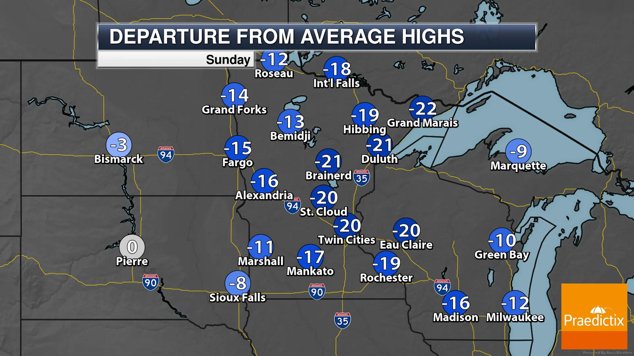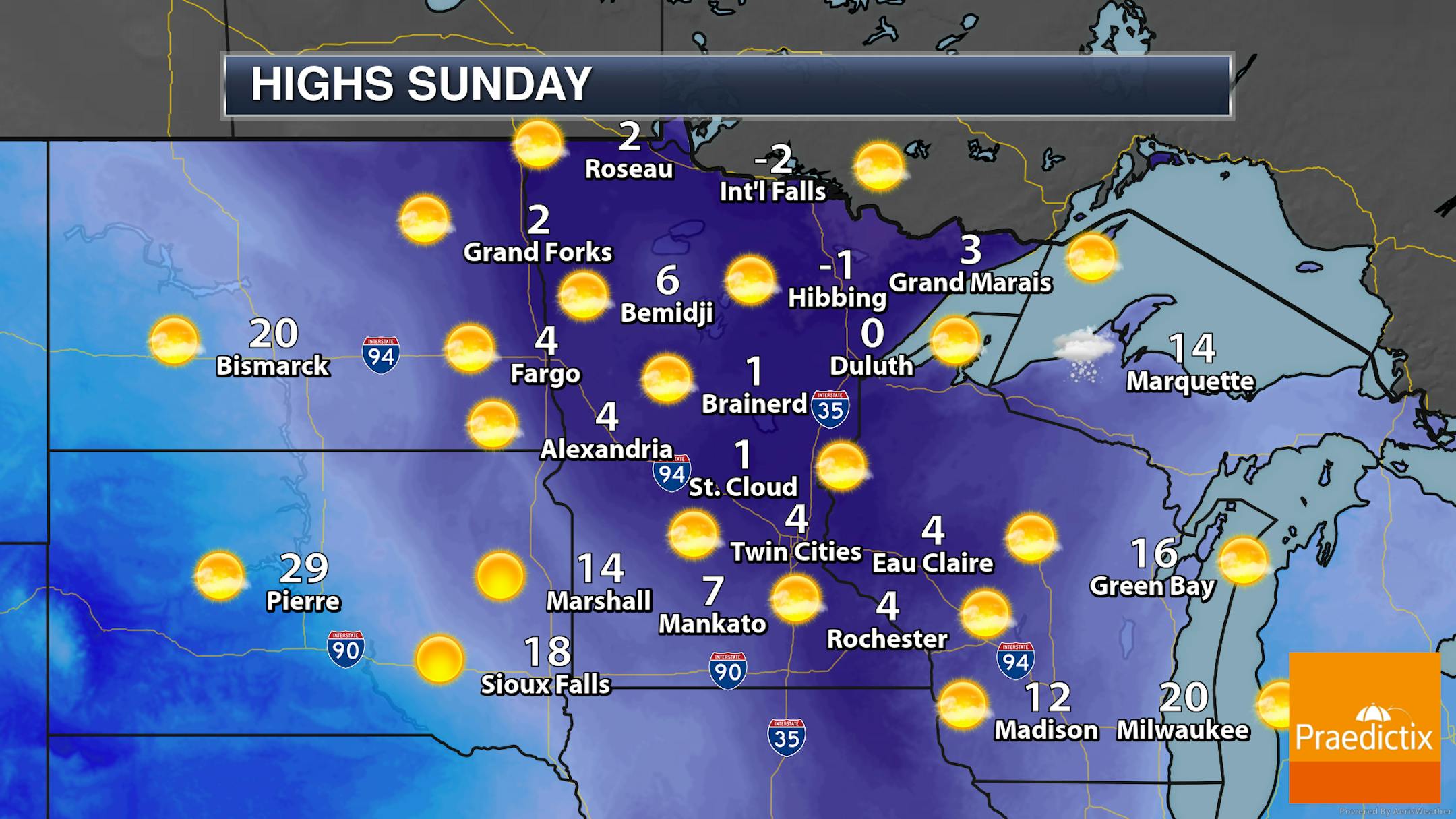 The good news is that most areas of the state should be able to dig themselves out of the negatives into the positive range during the afternoon hours Sunday... even if just barely. The warmest highs will be found as you head toward southwestern Minnesota, where places like Marshall should climb into the teens (above zero!).