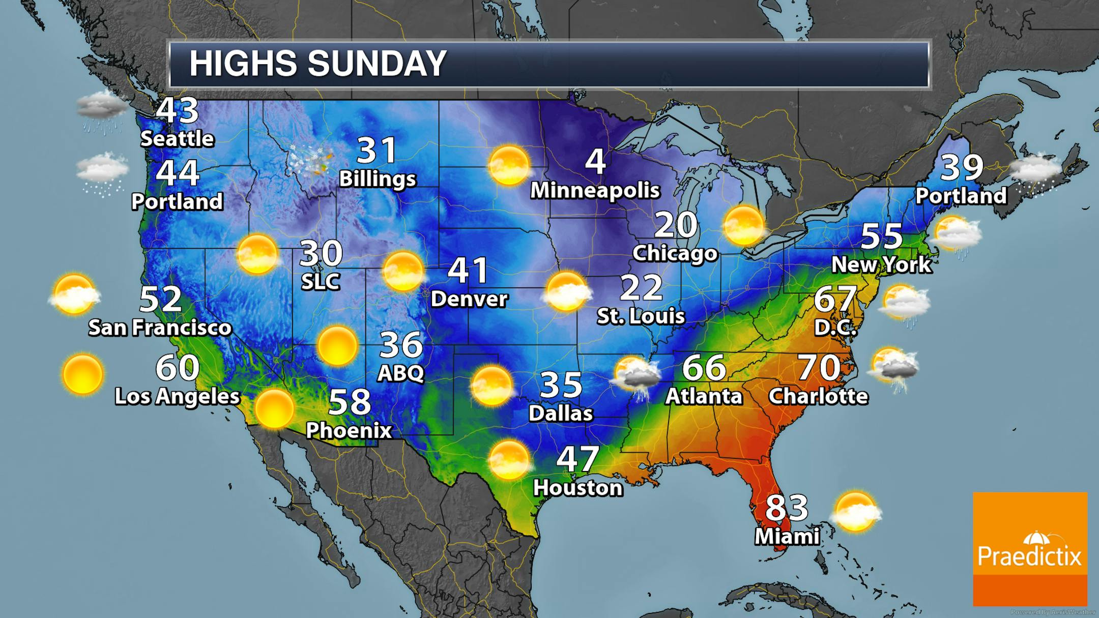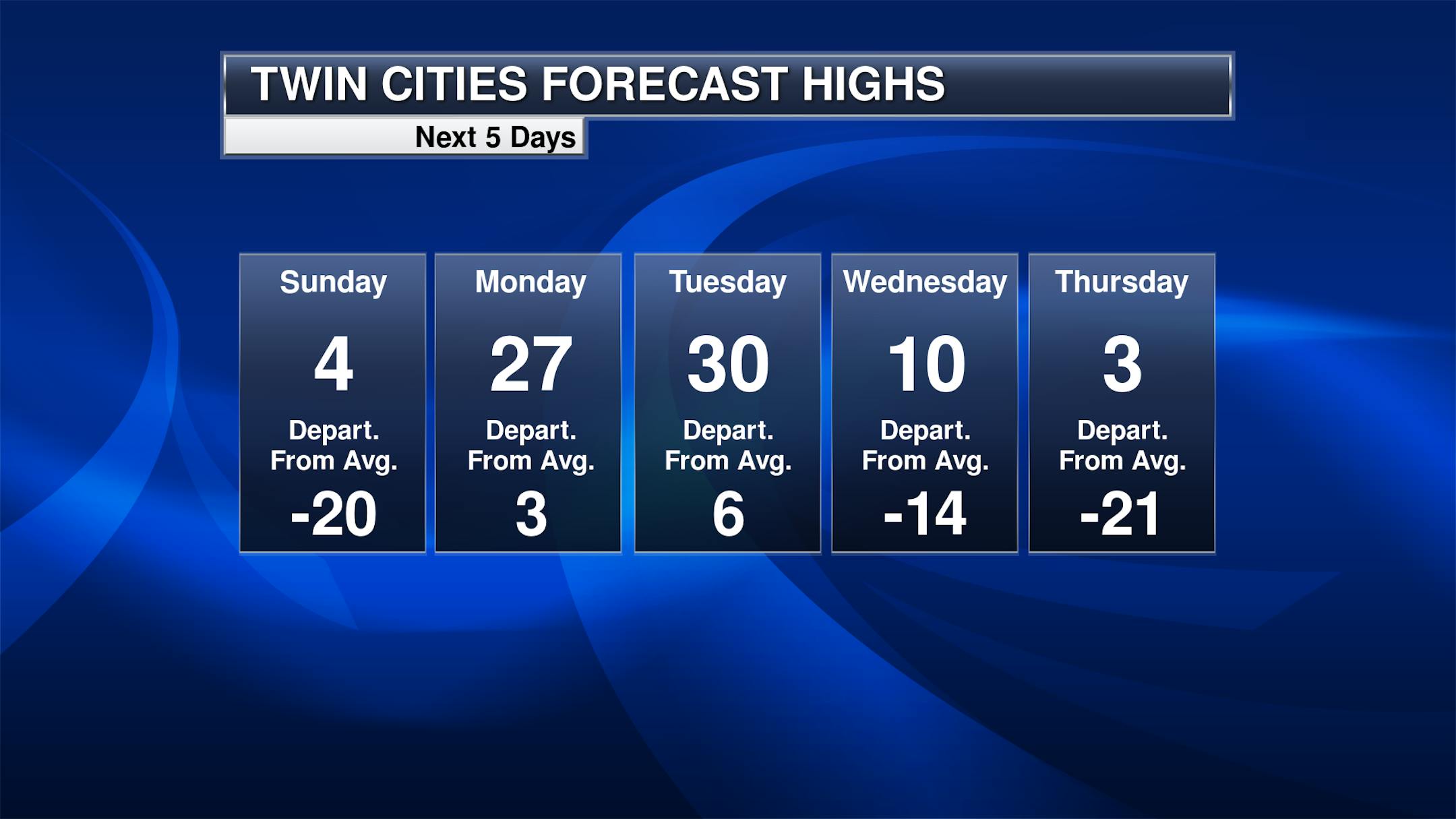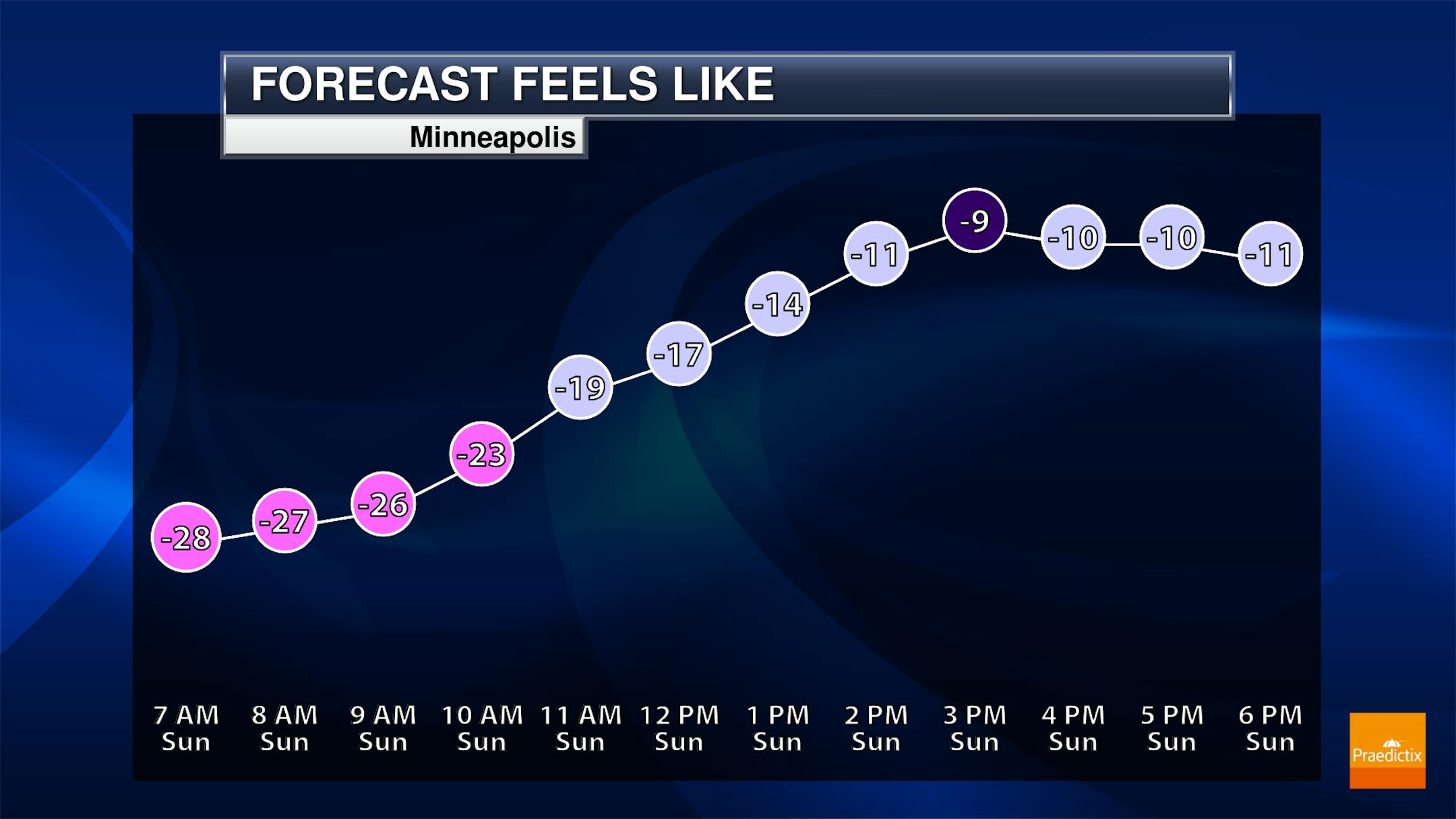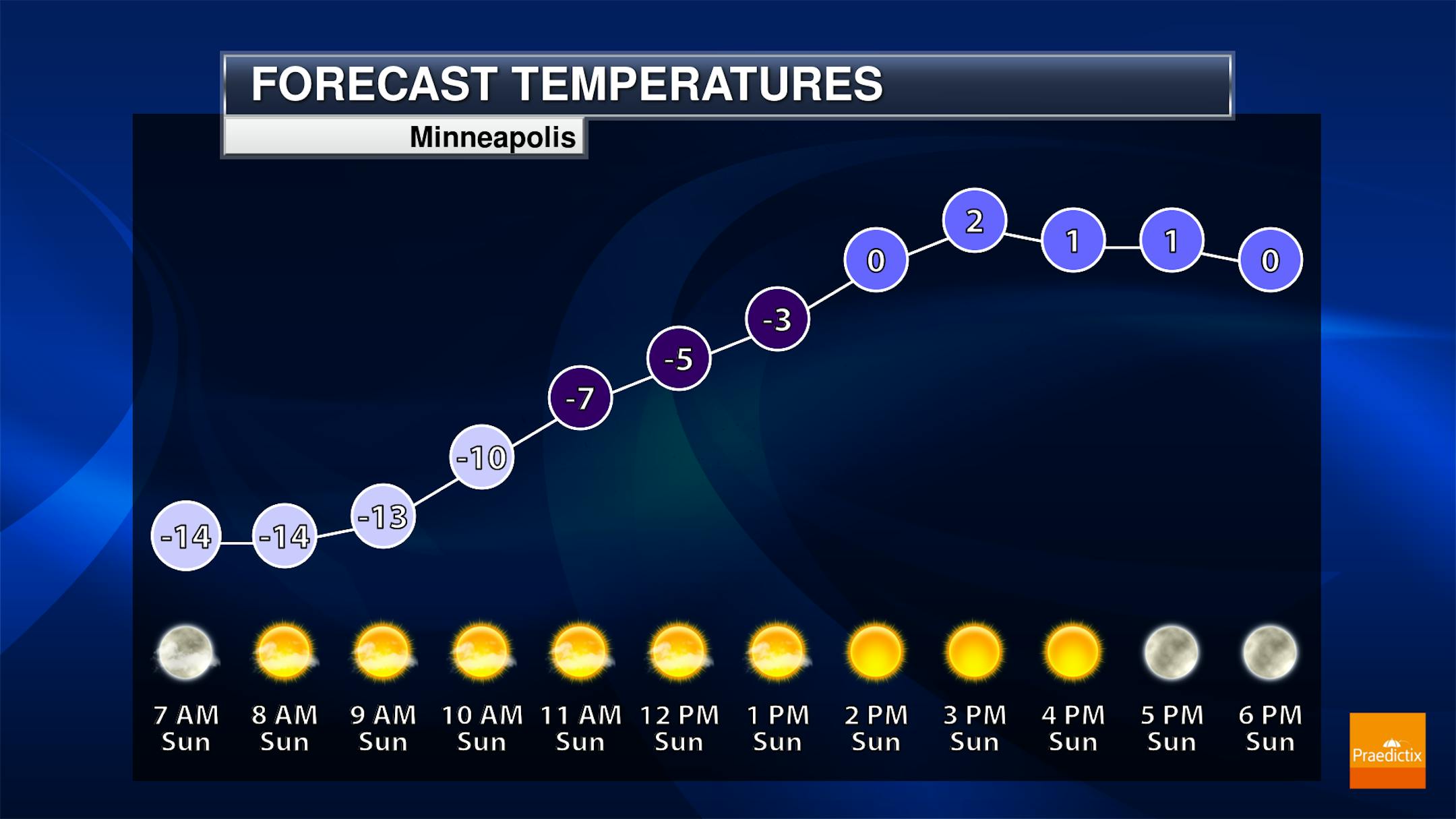 Here in the Twin Cities, we'll climb to a high of +4F during the afternoon hours Sunday - likely in either the mid or late afternoon timeframe. Temperatures, however, will stay below zero for much of the day after starting off in those mid-teens below zero.