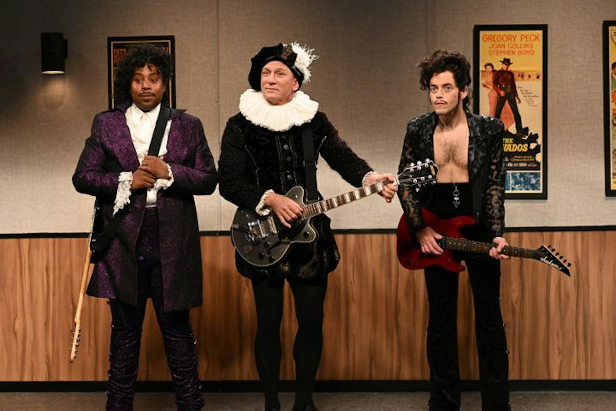 In the bit, guest host Rami Malek was battling cast member Kenan Thompson for the leading role in a movie about the late Minneapolis legend. Both played air guitar as they attempted to imitate the singer.