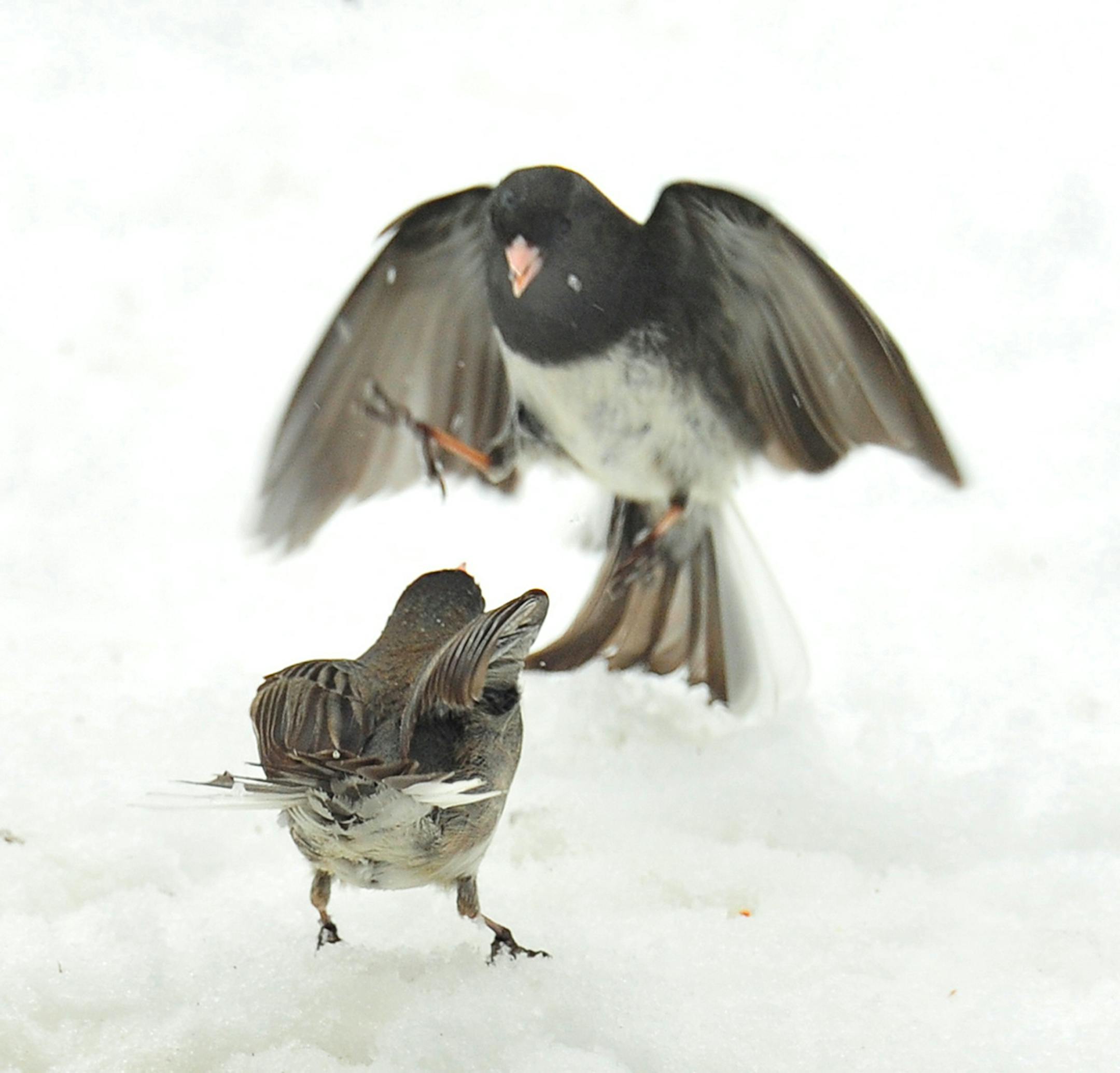 In the bird world equivalent of long underwear, juncos add 30% more feathers (by weight) before the onset of winter. They also seek out foods high in fat, like those millet seeds, to sustain their body heat. They stay with their own kind, foraging in small flocks of eight to 30 birds. This flocking behavior gives them an edge in spotting predators — more eyes on the skies — but it favors the larger males over females and young birds: Juncos maintain social hierarchies with older males claiming the inner part of a foraging circle, while females and younger birds are consigned to the outer edges.