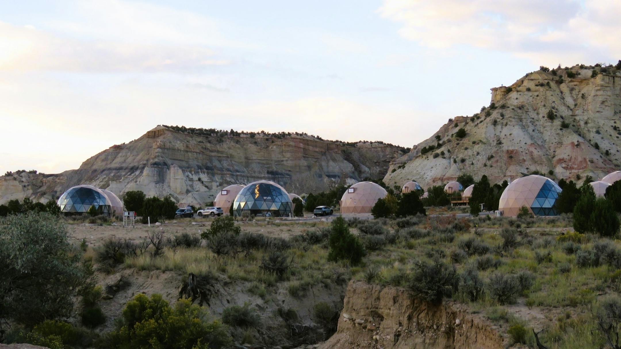 Dozens of geodesic domes dotted the wide rugged canyon like giant astronaut helmets, late-afternoon sun glinting off the visors.