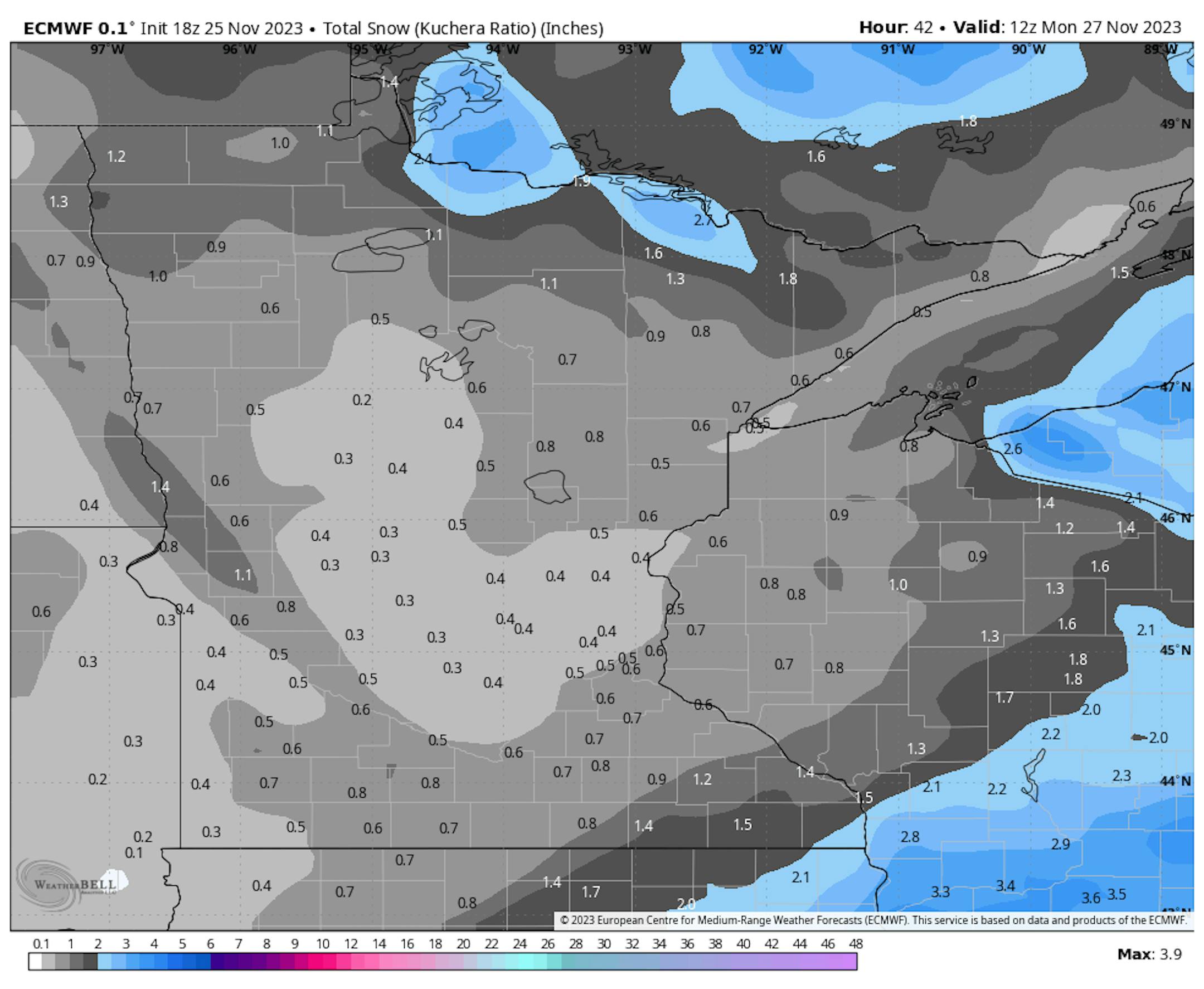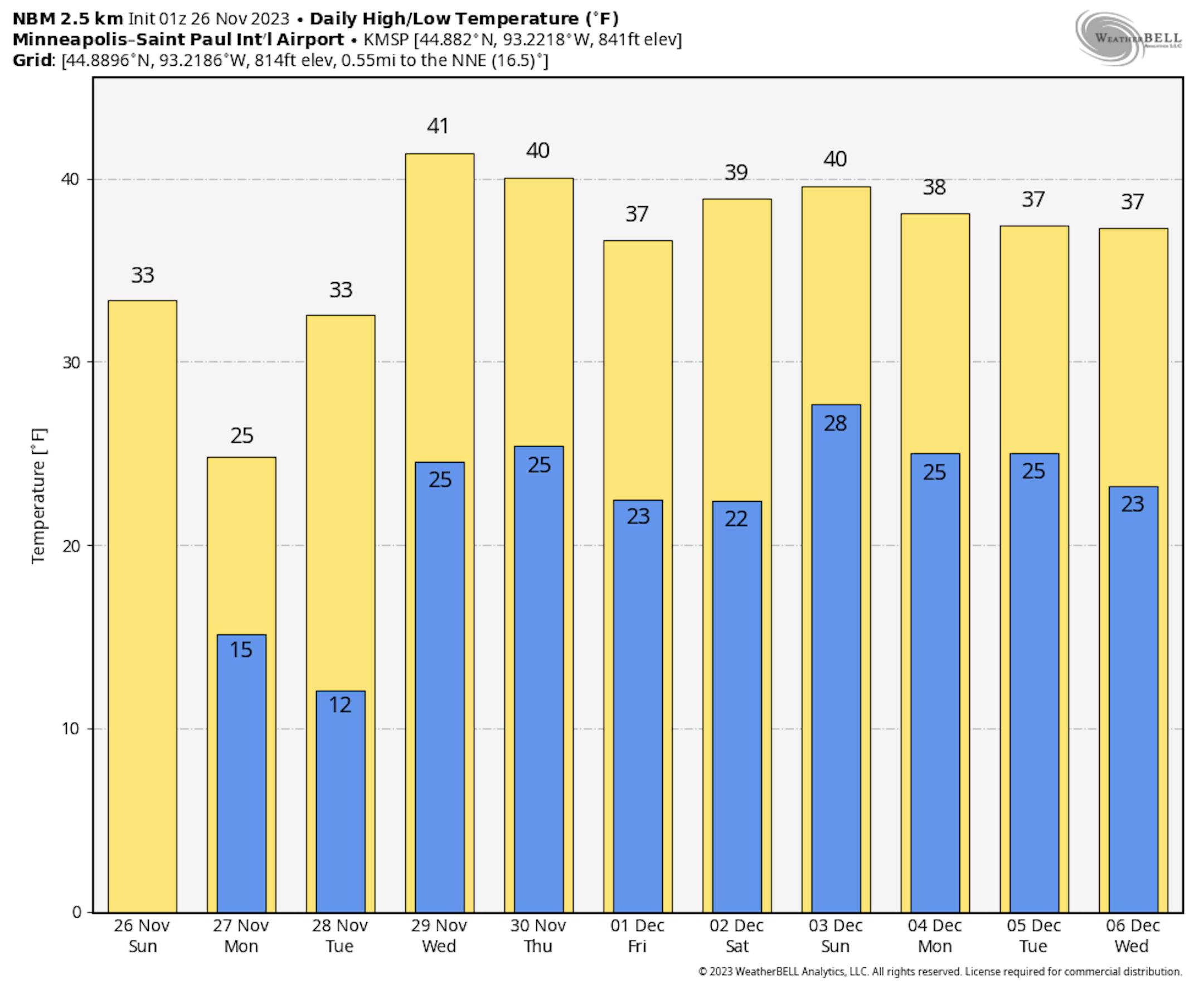 The weather outlook for the Twin Cities on Sunday, November 26th will be chillier than average by nearly -5F with highs struggling to get to the freezing mark under mostly cloudy skies. Feels like temps will only warm into the 10s and 20s with winds turning more northwesterly.