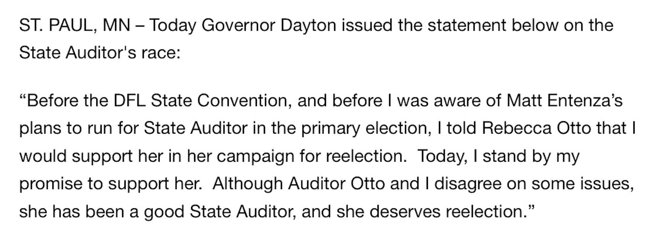 By Wednesday, DFL Gov. Mark Dayton added his voice to the storm. Dayton, about whom Entenza spoke admiringly in his campaign announcement, gave Otto his support in a statement: