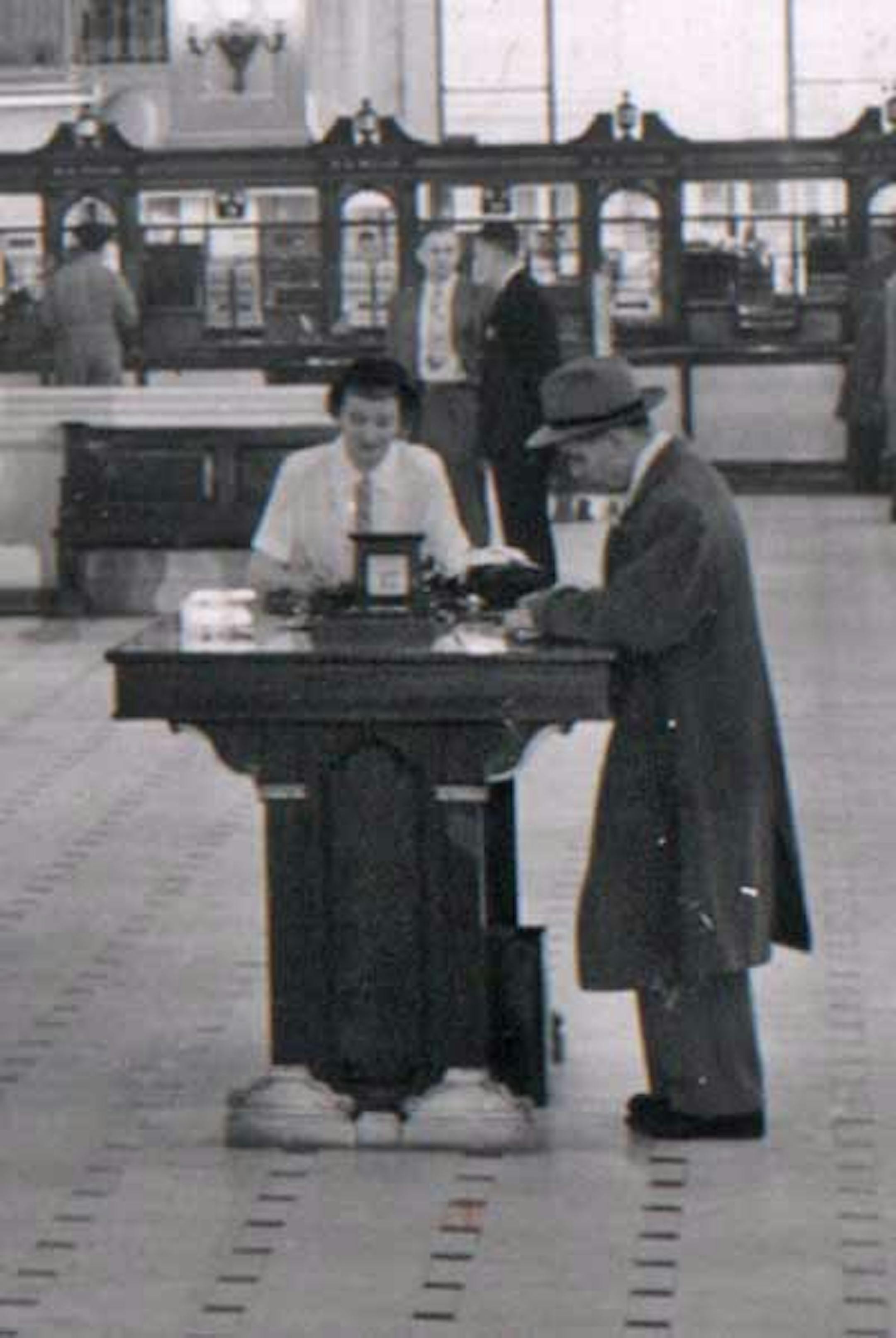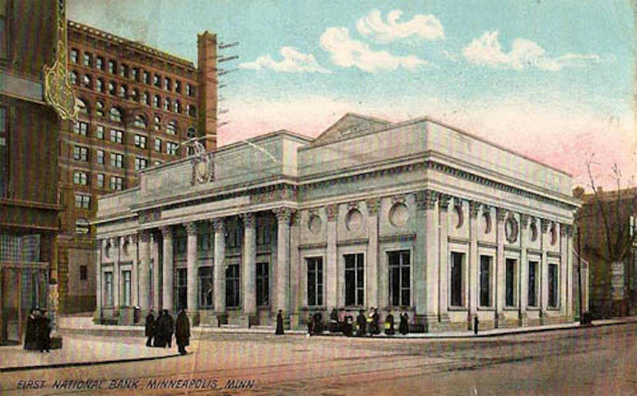 Here's a 1950s shot of the old bank lobby, fro the StarTribune archives: Probably never occurred to those folk it would all be apartments upstairs some day.