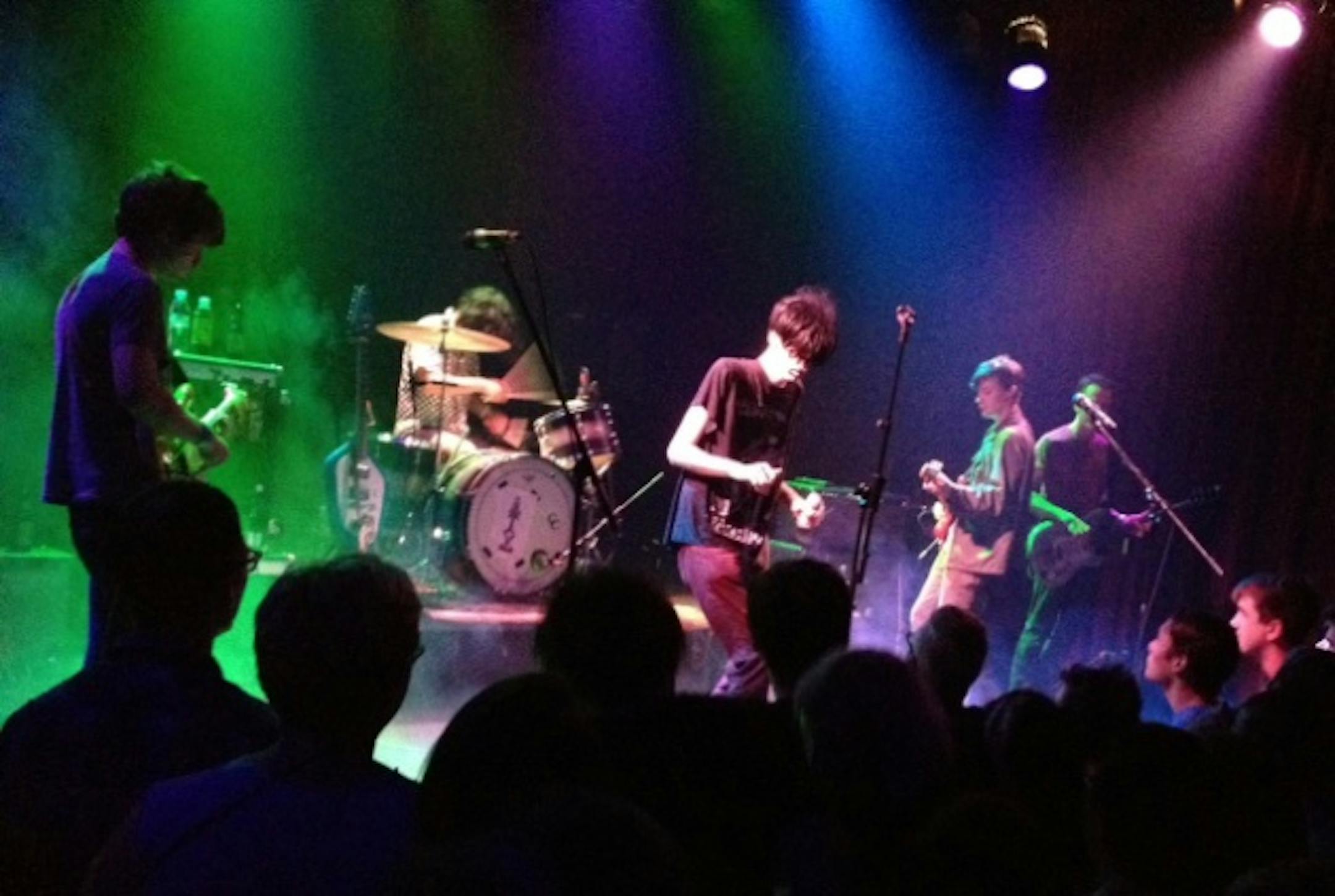 Cox didn't disappoint those who like their indie-rock demiurges to keep the show in showbiz. No thrift-store dresses for him on this hot night, but he did some crotch grabbing, shook a pair of maracas during the song "T.H.M.," rolled around on the floor a good deal, drooled copiously, balanced his spindly 6'4" frame atop the bass drum, ripped his wig off, and jumped into the crowd to chase a rambunctious fan who grabbed his wig at another moment.