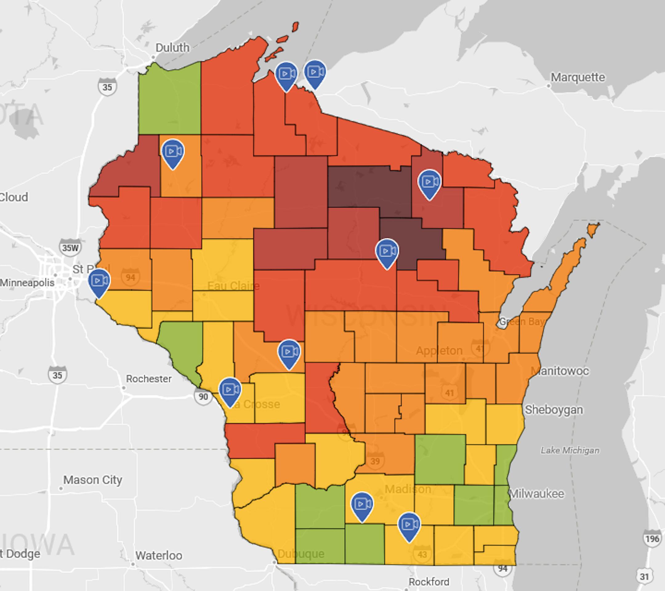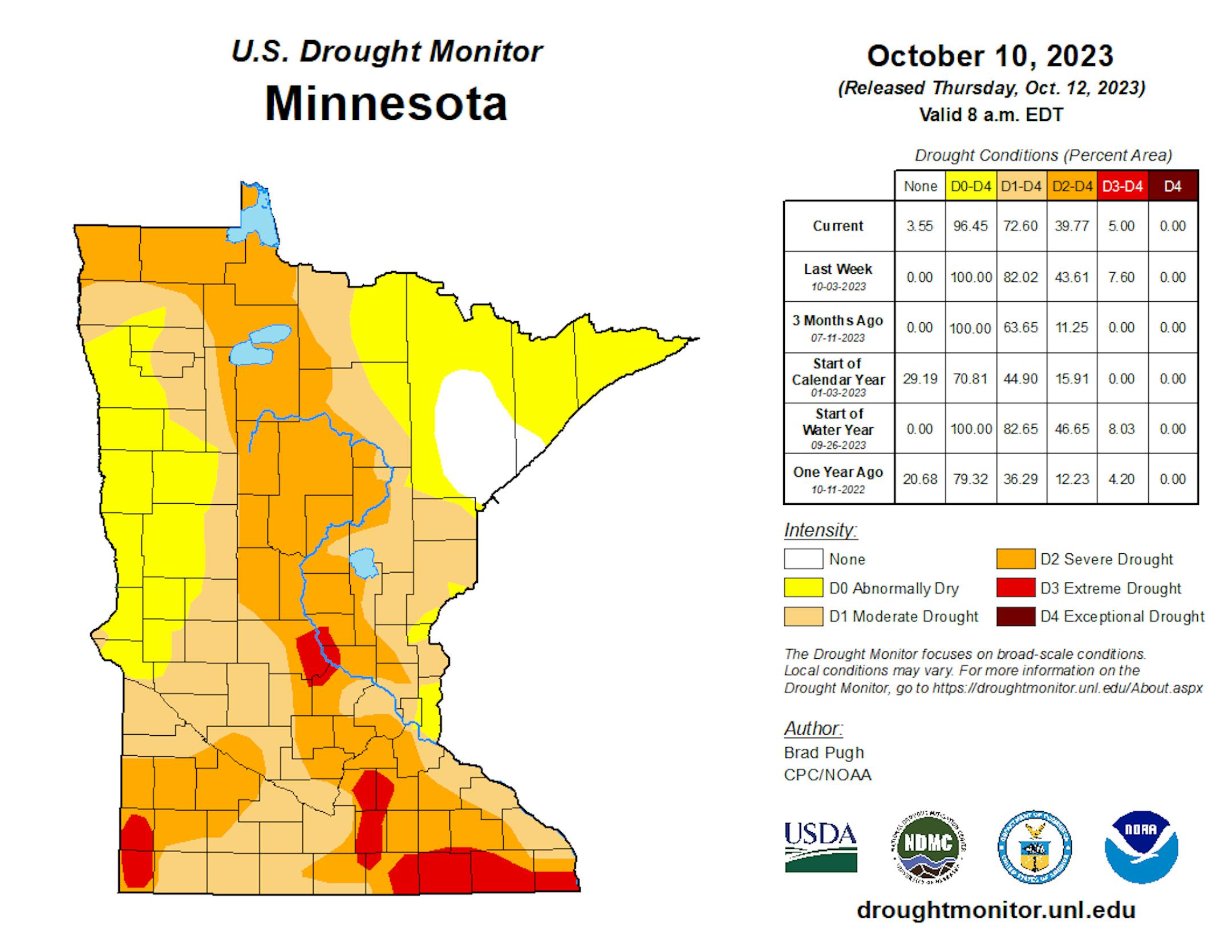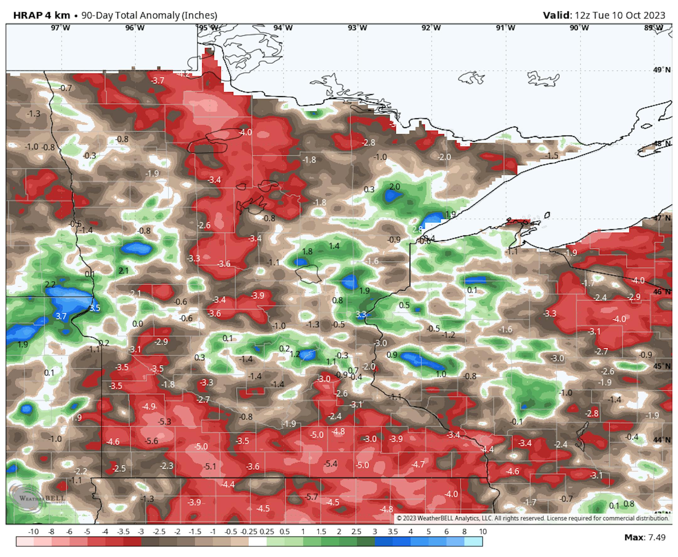 Thanks to some recent heavy rains parts of the state are now in a surplus over the last 90 days. Some of the biggest surpluses (which aren't many) are showing up in blue in pockets along and north of the Twin Cities and also just east of the metro in western Wisconsin.