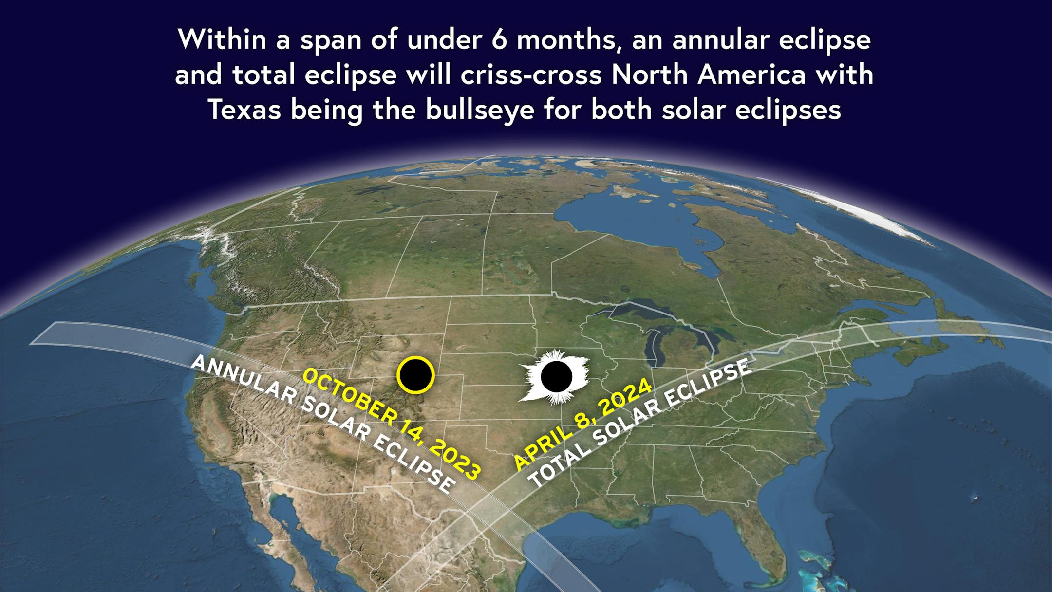 "Experience nature's greatest sight — a total eclipse of the Sun! On April 8, 2024, the shadow of the Moon will cross Mexico, the United States, and Canada. This spectacular total solar eclipse will amaze many millions of people. This is sure to be a record-setting astronomical event. Before that, the US is lucky to have a celestial warm-up act - an annular solar eclipse from Oregon to Texas on October 14, 2023. The next two solar eclipses in North America will be the Annular Solar Eclipse on October 14, 2023 and the Total Solar Eclipse on April 8, 2024! The Annular Solar Eclipse of 2023 will cross the US from Oregon to Texas and then will proceed to Central America and South America. The Total Solar Eclipse of 2024 will sweep across North America from Mazatlán to Newfoundland. A Total Solar Eclipse is truly spectacular; you will have the unique opportunity to stand in the shadow of the moon and witness the sun's exquisite corona."