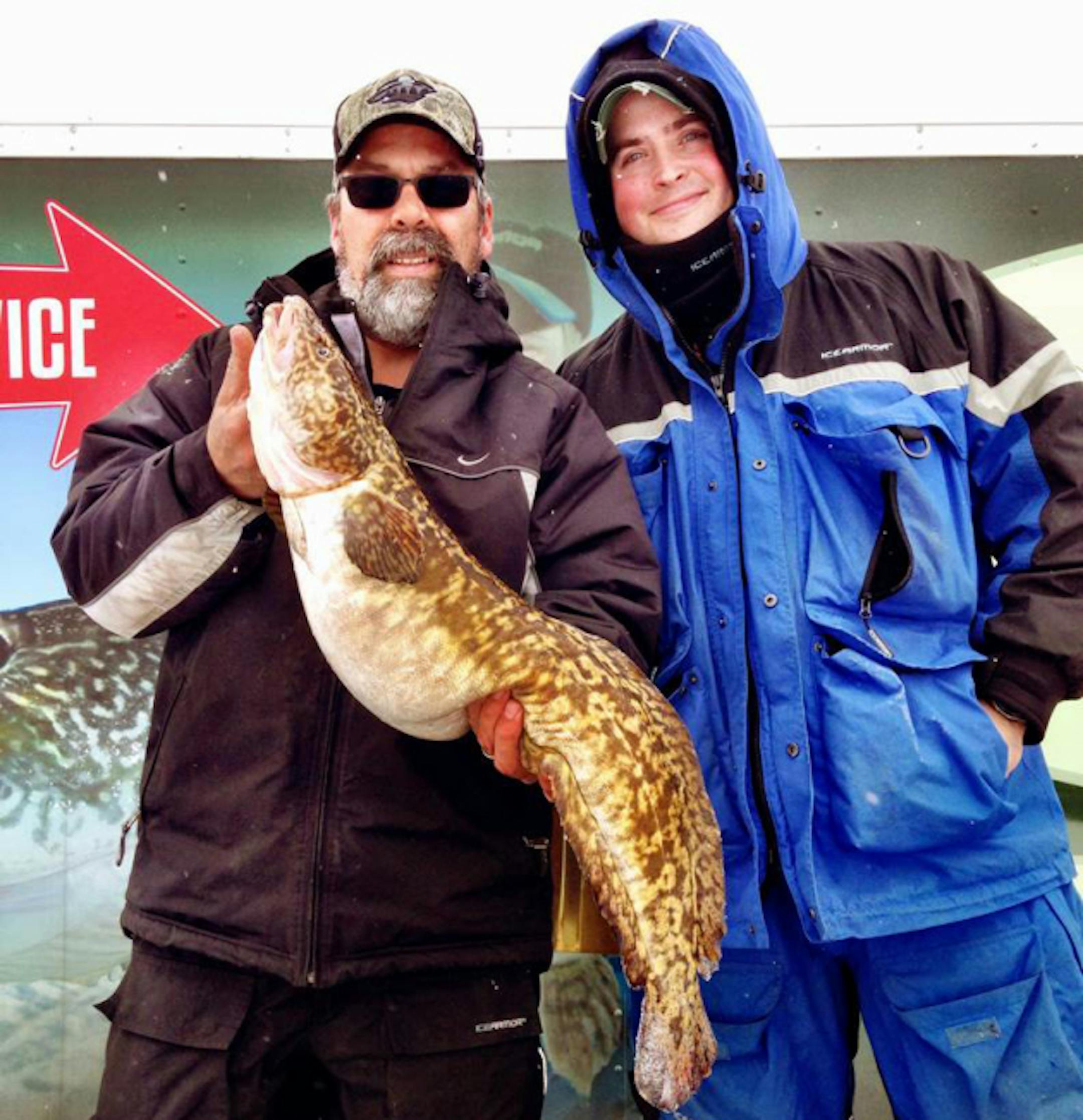 Scott Swanson of Golden Valley caught the biggest eelpout, an 11.98-pound dandy. With him is Jason Freed, a guide with Leisure Outdoor Adventures, which runs the contest.