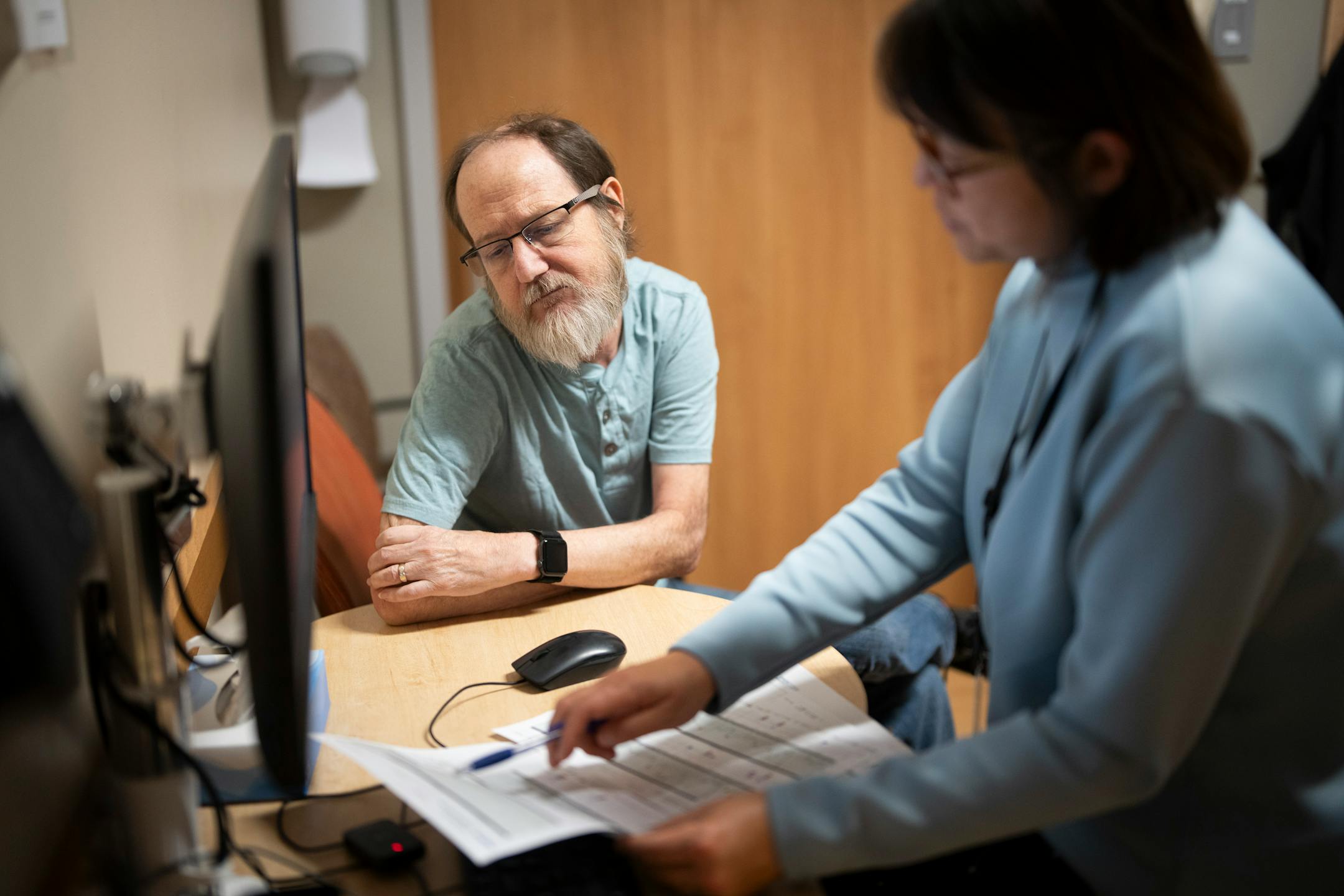 At the Hennepin Healthcare Center of Diabetes and Endocrinology in downtown Minneapolis, 66-year-old Mark Harris tries to recall his medication intake and sleep schedule from the past week.