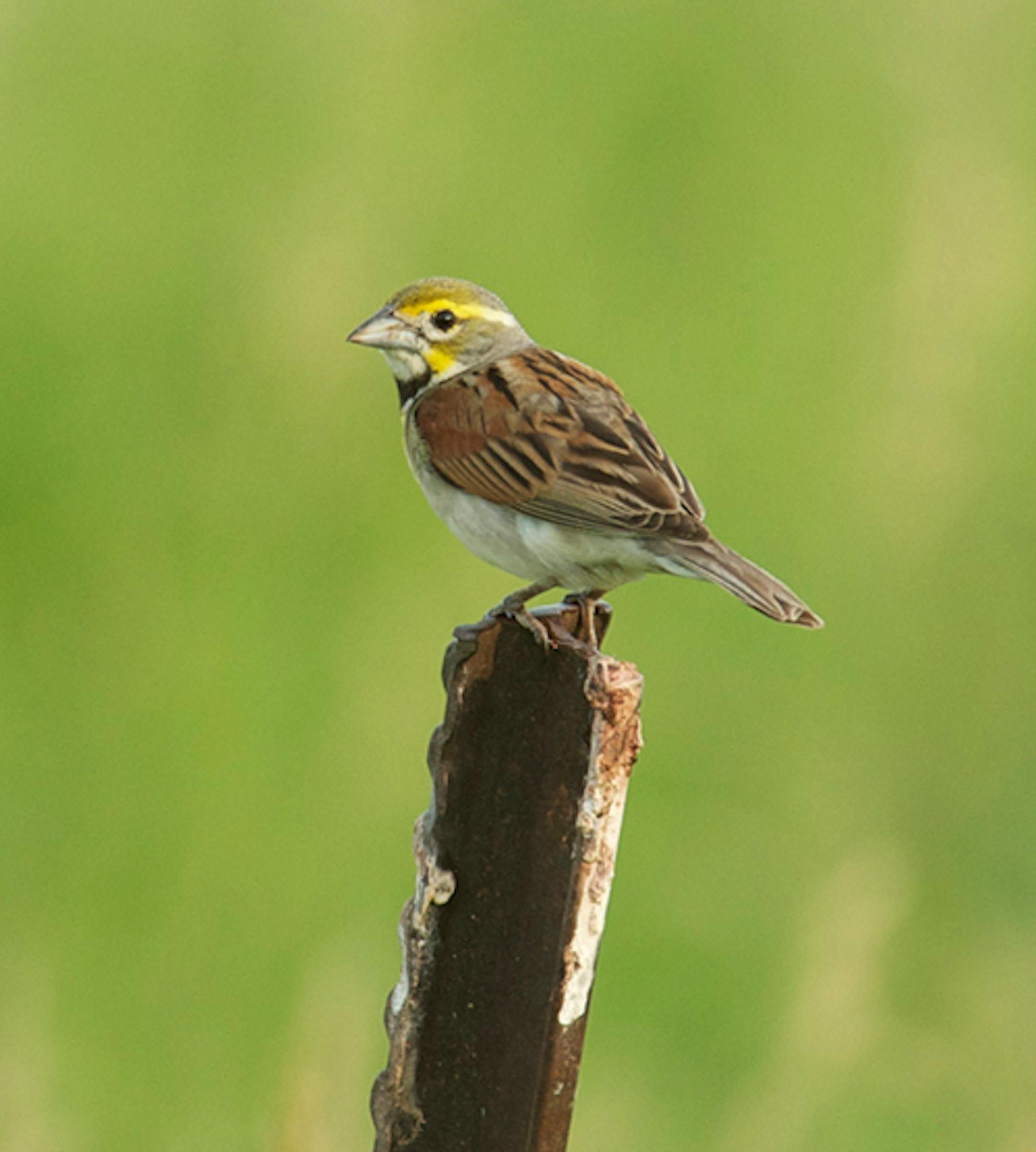 Dickcissels are sparrow-sized grassland birds with a passing resemblence to meadowlarks. Their prime breeding area is to our south, from Iowa into Missouri. Minnesota is on the northern edge of a circle that defines territory Dickcissels visit on an erractic and scattered basis. Some years, few Dickcissels. Other years are like this one -- Dickcissels everywhere. They're even being seen in the metro area, most unusual. They like hayfields, uncut grass shin to knee deep. Some birders in the state are talking of trying to find the species in each of our 87 counties, which would be more than unusual. Wisconsin birders are working on the same project over there. I was near Murdo, South Dakota, yesterday, and, yes, Dickcissels were easy to find. It was the first time I've seen that species in S.D. Dickcssels are late arrivals in spring migration, coming here from wintering grounds in central and South America. I watched courtship yesterday, males chasing females. Here is a Dickcissel found in Carver County last summer.