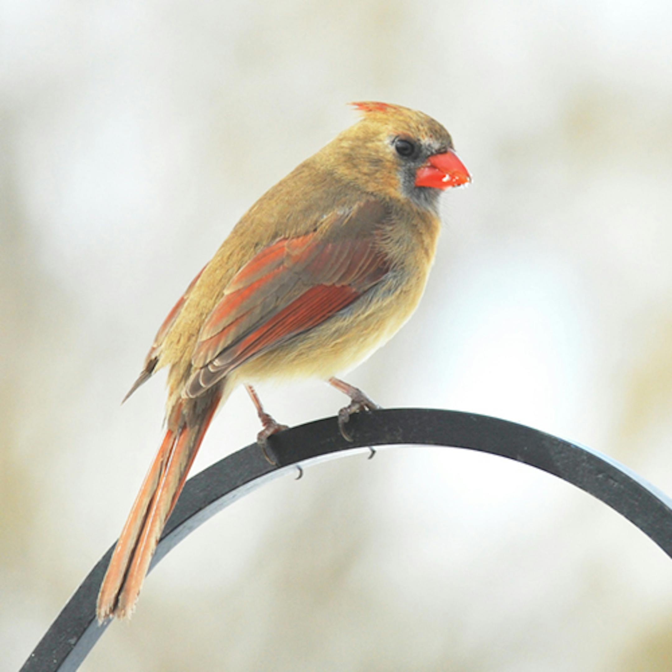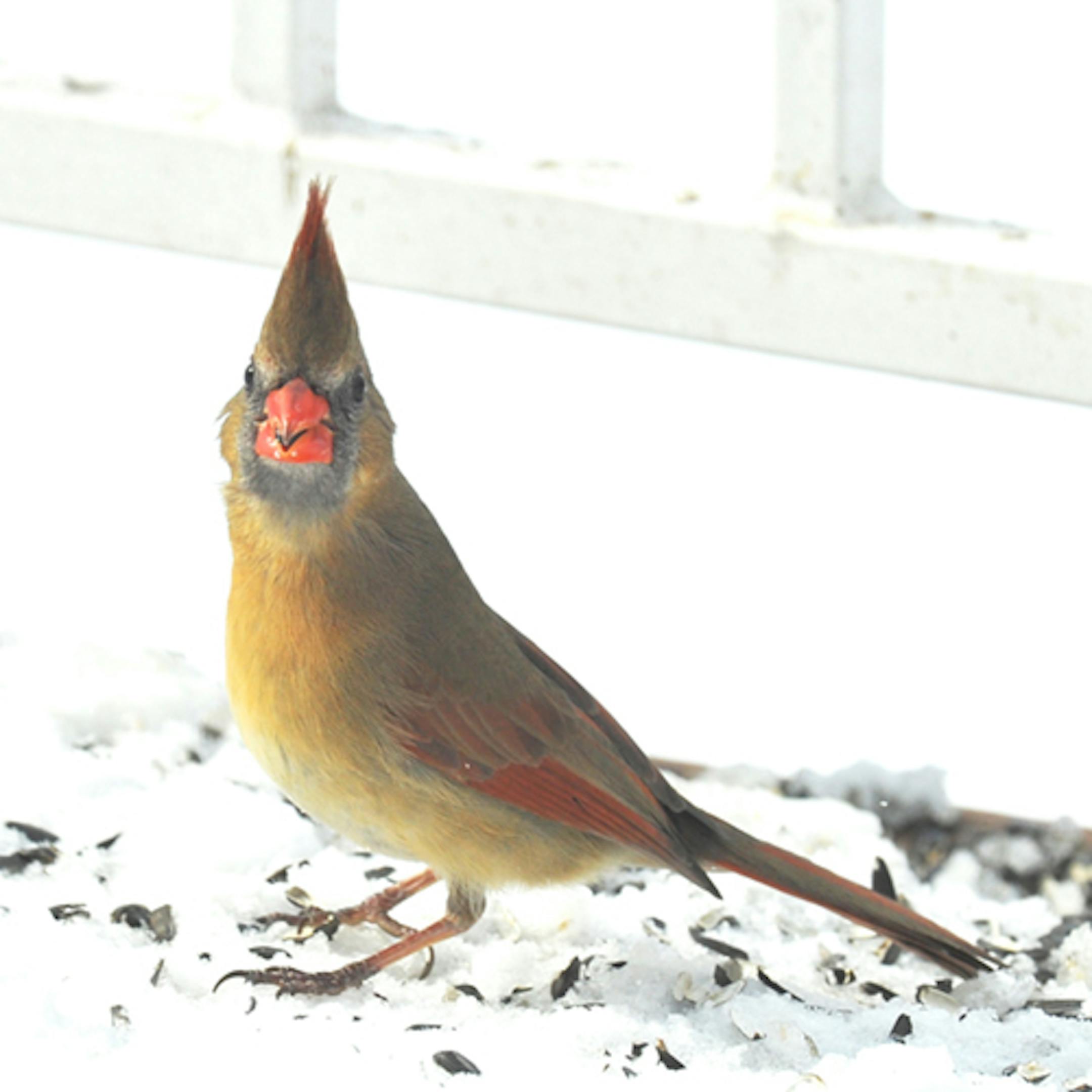 The cardinal, a female, was sitting on a feeder post on our deck before prior to snow seed foraging. I was inside, a double pane of glass between us, like 10 feet. I took four or five photos, bird on the post, bird with seed. On shot number six the bird became very alert, crest upright, eyes snapped toward me. You can see what happened as I took photo seven.