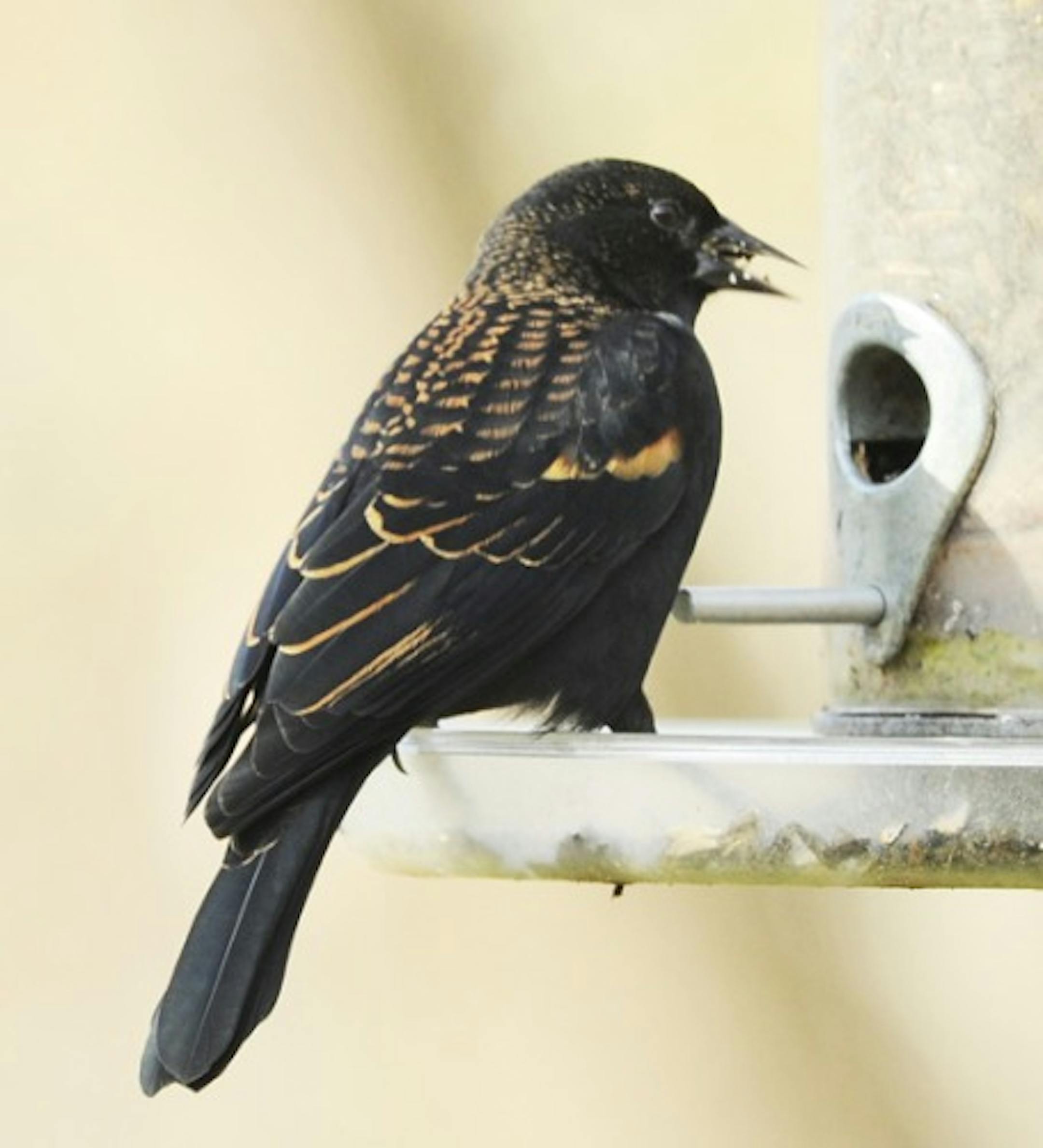 This male Red-winged Blackbird, photographed at one of our feeders earlier this week, doesn't look like the shiny black Red-wings that are seen in the spring. This bird is in its fall/winter plumage, sporting new feathers, the edges of which, as you see, are marked with brown and buff. The epaulet shows only yellow, the bold red marking the bird shows in the spring now covered. The bird will gain its springtime appearance not by another set of feathers, but by simple wear and tear. The brown and buff edges will wear off, revealing the unmarked black of spring. Wear also will reveal the red epaulet. Not all birds enjoy such a handsome basic plumage. It's called basic, by the way, because this is the plumage grown after the bird's complete (as opposed to partial) molt. It's the non-breeding plumage. The male Red-wing enters spring courtship with an immaculate and glossy black plumage (the better to catch your eye, my dear).