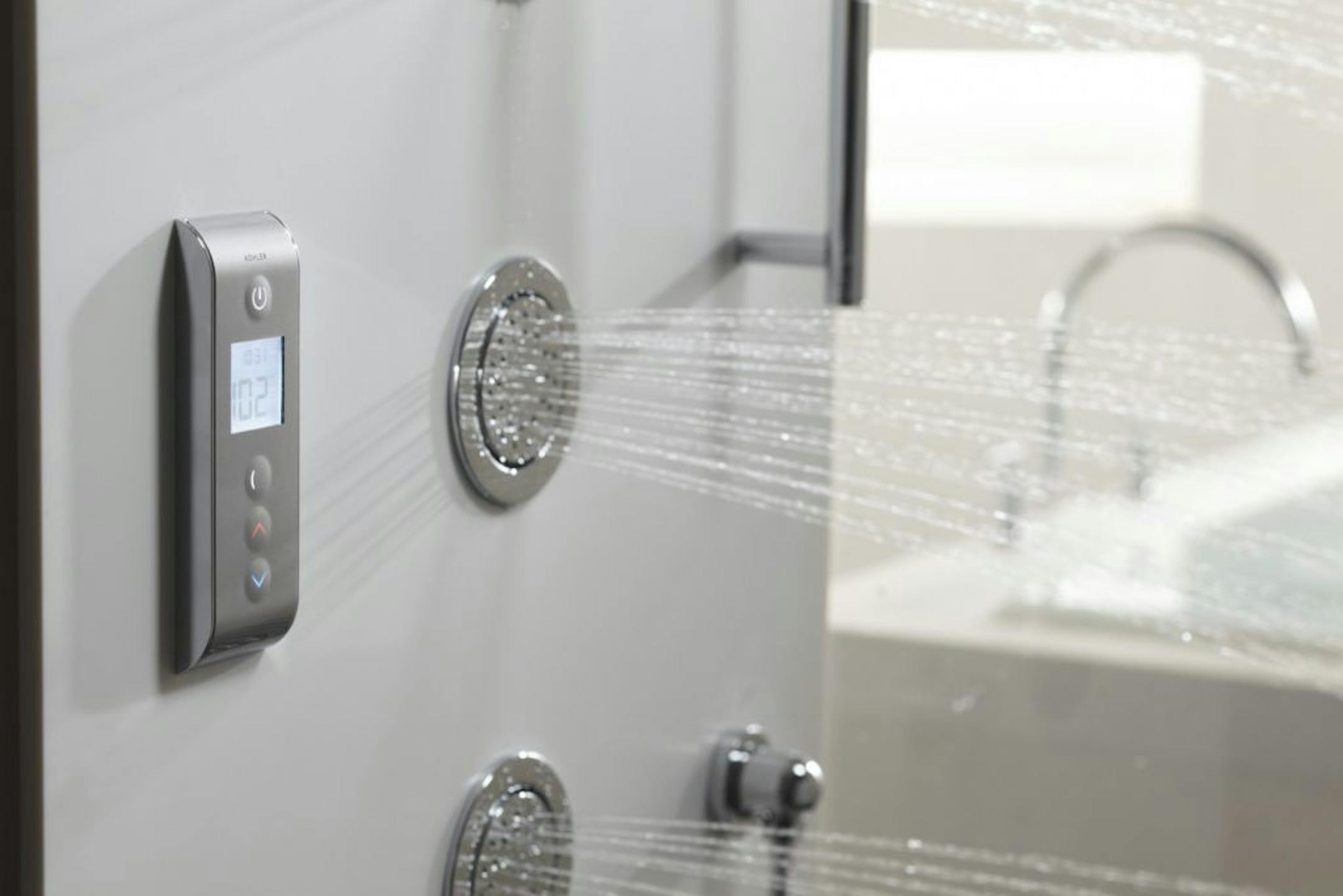 For instance, you can zone off different showerheads and, with the push of a button, change the water direction. Or automatically fill your bathtub to the perfect temperature while you're shaving. Operating controls can also be added outside the shower area, so you can start your shower as soon as you get out of bed, then walk right into a nice hot shower. Bright display screens can show the water temperature and how the water is being controlled.
